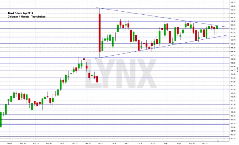 Am Freitag ging der DAX mit einem Tagesverlust von 0,55 Prozent bei 10.587,77 Indexpunkten aus dem Xetra-Handel. Der XDAX notierte um 22:15 Uhr bei 10.522,75 Punkten. An der Wall Street beendete der Dow Jones den Handelstag mit 18.395,40 Punkten, die Rekordmarke liegt hier bei 18.668,44 Punkten. Der NASDAQ 100 notierte zum Handelsschluss bei 4.783,694 Punkten, die Rekordmarke liegt bei 4.837,67 Punkten. Der breit gefasste S&P 500 schloss mit 2.169,04 Zählern, der Rekord beträgt 2.193,81 Punkte. Der Euro notierte nach US-Börsenschluss bei 1,1198 US-Dollar. Eine Feinunze Gold war am Spotmarkt für 1.321,18 US-Dollar zu haben, Rohöl der Nordseesorte Brent kostete zum US-Handelsschluss im Oktober-Kontrakt 49,92 US-Dollar das Fass. Der Euro-Bund-Future notierte am Freitag an der EUREX mit einem Schlusskurs von 167,01 Zählern. Die Rendite für zehnjährige Bundesanleihen liegt aktuell bei -0,07 Prozent. Bundeswertpapiere bis zu einer vierzehnjährigen Laufzeit rentieren mit einem Negativzins. Der Spread zwischen zehnjährigen deutschen Bunds und zehnjährigen US-Staatsanleihen (1,63 Prozent Rendite) liegt damit bei 170 Basispunkten. In der neuen Handelswoche begibt die Finanzagentur des Bundes am 31.08.2016 Kapitalmarktinstrumente (Schatz) mit einer zweijährigen Laufzeit und einem Emissionsvolumen von 4,0 Mrd. Euro (Aufstockung).