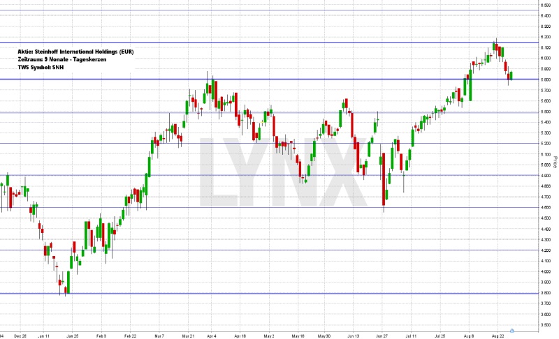 Seit Mitte Dezember des letzten Jahres tendiert die Aktie von Steinhoff International Holding generell aufwärts, wobei die eine oder andere charttechnisch etwas unsauberere Abwärtsbewegung durchaus vorkam. Die Aufwärtsbewegungen fanden im Kern von Januar bis April dieses Jahres statt und von Ende Juni bis zum jetzigen Zeitpunkt. Die aktuelle Aufwärtsbewegung startete im Bereich um die Marke von 4,60 EUR und hatte ihr Hoch knapp vor 6,20 EUR. Der aktuelle Schlusskurs liegt, nach einer kurzen Konsolidierung, nur knapp unter 5,90 EUR. Die Unterstützung bei 5,80 EUR ist aus aktueller Sicht die entscheidende Marke für eine von einem sauberen Trendvorteil charakterisierte Fortsetzung der vorherrschenden Aufwärtsbewegung. Ein Absacken hinab auf 5,60 EUR würde zwar noch keinen Bruch des Longtrends bedeuten, sollte jedoch zu etwas mehr Vorsicht führen. Nächste realistische Ziele für Käufe wären zum einen das aktuelle Hoch im Bereich 6,20 EUR und folgend Kurse in Richtung 6,40 EUR. Bei einem nachhaltigen Bruch der Unterstützung von 5,50 EUR sollte eine erneute Analyse erfolgen, da die Gefahr einer längeren Konsolidierungsphase steigt und ein gewinnbringender Vorteil rapide abnimmt.