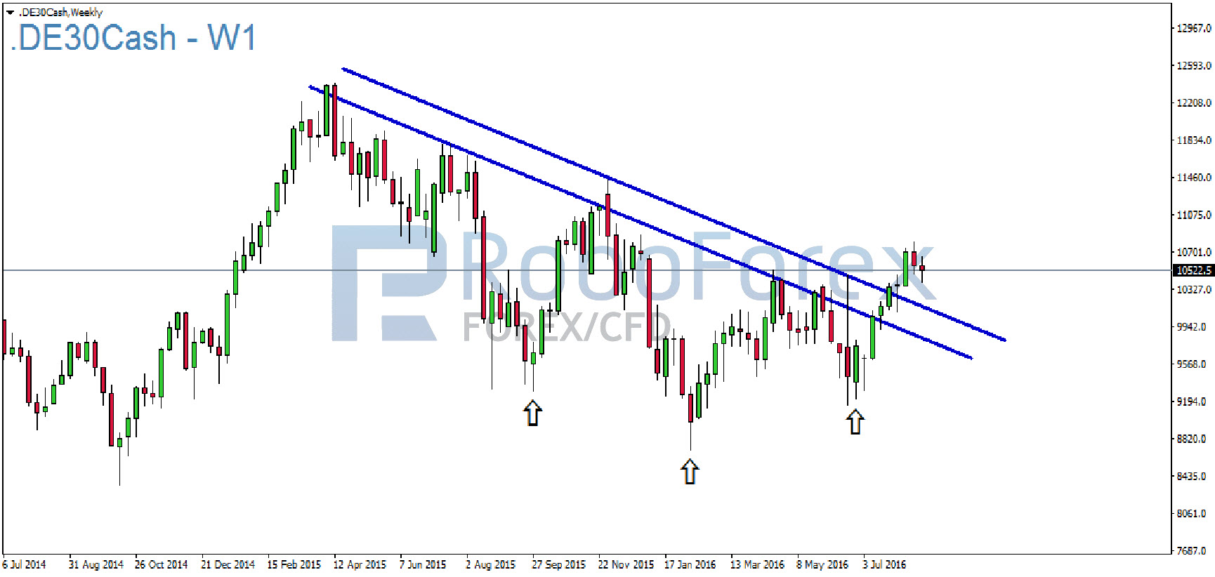 Der übergeordnete Wochenchart macht deutlich, dass der deutsche Leitindex eine Trendwende vollziehen konnte. Auch der relativ impulslose August nähert sich langsam dem Ende und die nächsten Zinsentscheide von EZB und FED rücken langsam wieder auf die Agenda. Janet Yellen verabschiedete sich dabei bereits am vergangenen Freitag mit ihrer Rede beim Treffen der Notenbanker in Jackson Hole aus der Sommerpause. Dabei betonte sie, dass die wirtschaftliche Lage sich zwar gebessert habe und dies grundsätzlich eine weitere Zinsanhebung rechtfertigen würde, aber sie blieb auch noch vage genug um ggf. auch noch eine andere Entscheidung am 21. September rechtfertigen zu können.