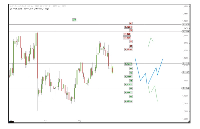Das Hoch im Betrachtungszeitraum liegt knapp unter dem der vorletzten Periode. Der EUR konnte die 1,1366 nicht erneut anlaufen. Dafür bildete er ein Tief aus, dass deutlich und nachhaltig unter dem der vorletzten Betrachtungsperiode liegt. Die Wochen-Range lag mit 206 Pips über dem entsprechenden Korrespondenzwert. Insgesamt ist die Bewegung in den vergangenen fünf Handelstagen als bärisch einzustufen. Der EUR hat es nicht geschafft, sich über der OK des AWK zu stabilisieren. Somit muss der Ausbruch Mitte August als Fehlausbruch interpretiert werden.