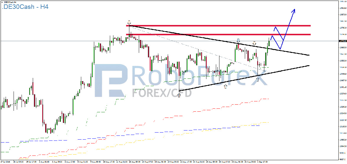 Das fallende Dreieck aus der Vorwoche hat sich im H4-Chart zu einem gleichseitigen Dreieck entwickelt. Die untergeordnete Trendlinie der Vorwoche ist in grau gestrichelt eingezeichnet. Nachdem diese Trendlinie bullish gebrochen worden ist, hat der DAX das bullishe Signal nicht nachhaltig durchsetzen können. In der Folge wurden auf der Ober- und Unterseite neue Trendlinien ausgebildet. Diese Formation ist durch den US-Arbeitsmarktbericht am Freitag erneut bullish aufgelöst worden. Daher dürfte der DAX nun den Widerstand bei 10.800 Punkten anvisieren.