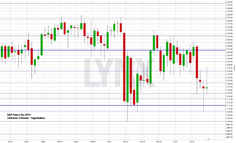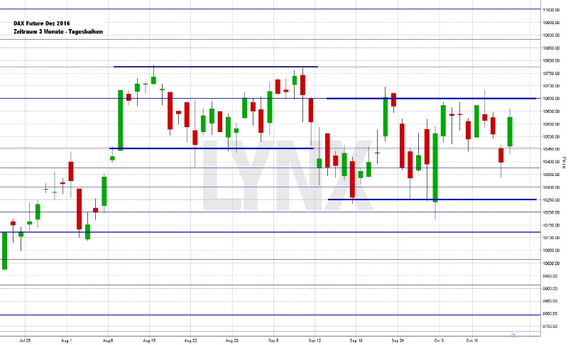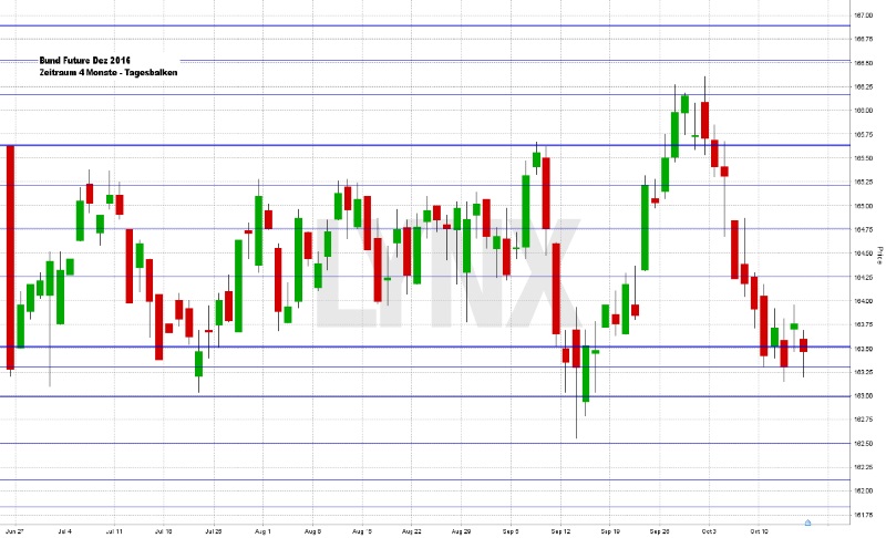 Am Freitag ging der DAX mit einem Tagesplus von 166,31 Punkten oder 1,60 Prozent bei 10.580,38 Indexpunkten aus dem Xetra-Handel. Zum Wochenschluss hat es für den DAX sogar noch zu einem Wochenplus von 0,85 Prozent gereicht. Der XDAX notierte um 22:15 Uhr bei 10.587,91 Punkten, der FDAX schloss an der EUREX mit 10.580,00 Punkten. An der Wall Street beendete der Dow Jones den Handelstag mit 18.138,38 Punkten, die Rekordmarke liegt hier bei 18.668,44 Punkten. Der NASDAQ 100 notierte zum Handelsschluss bei 4.808,485 Punkten, die Rekordmarke liegt bei 4.904,72 Punkten. Der breit gefasste S&P 500 schloss mit 2.132,98 Zählern, der Rekord beträgt 2.193,81 Punkte. Der Euro notierte nach US-Börsenschluss bei 1,0972 US-Dollar. Die Feinunze Gold war am Spotmarkt für 1.251,03 US-Dollar zu haben, Rohöl der Nordseesorte Brent kostete zum US-Handelsschluss im Dezember-Kontrakt 51,95 US-Dollar das Fass. Der Euro-Bund-Future notierte am Freitag an der EUREX mit einem Schlusskurs von 163,23 Zählern. Die Rendite für zehnjährige Bundesanleihen liegt aktuell bei 0,05 Prozent. Der Spread zwischen zehnjährigen deutschen Bunds und zehnjährigen US-Staatsanleihen (1,80 Prozent Rendite) liegt damit bei 175 Basispunkten. In der neuen Handelswoche begibt die Finanzagentur des Bundes am 19.10.2016 Kapitalmarktinstrumente (Bund) mit einer dreißigjährigen Laufzeit und einem Emissionsvolumen von 1,0 Mrd. Euro (Aufstockung).