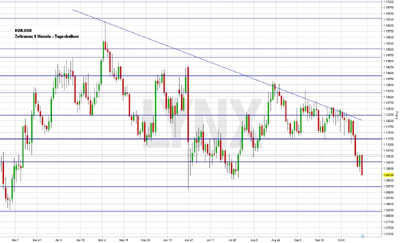 Der japanische Aktivitätsindex der Gesamtwirtschaft für den Monat August steht am Freitag um 06:30 Uhr auf der Agenda der Händler. Um 10:30 Uhr folgt die Nettokreditaufnahme des britischen öffentlichen Sektors im September. Um 14:30 Uhr stehen die kanadischen Einzelhandelsumsätze und Verbraucherpreise für den August an. Aus den USA werden um 15:45 Uhr die Markit-Einkaufsmanagerindizes für das verarbeitende Gewerbe, das Dienstleistungsgewerbe und gesamt (composite) im Oktober veröffentlicht. Das Oktober-Verbrauchervertrauen für die Eurozone gilt es um 16:00 Uhr zu beurteilen. Der Baker-Hughes Rig Count wird um 19:00 Uhr ausgegeben, um 21:30 Uhr folgt der CoT-Berichtder CFTC und um 23:45 Uhr die neuseeländischen Einzelhandelsumsätze. Die grafisch aufbereiteten COT-Daten bekommen Anleger auf der Seite Commitments of Traders Report von LYNX tagesaktuell zur Verfügung gestellt. 80 weitere Konzerne berichten von ihren aktuellen Zahlen, darunter Daimler (DE), General Electric (US), McDonaldʼs (US), SAP (DE), Tomra Systems (NO), TomTom (NL), Moodyʼs (US) und Honeywell (US). Um 13:00 Uhr findet der kleine Verfallstag an der EUREX statt – es verfallen Optionen auf den DAX und Einzelaktien.