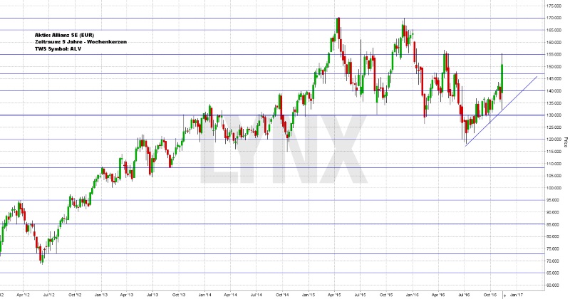 Nach einem nahezu kontinuierlichen Anstieg der Allianz-Aktie seit Juli 2012 setzte im April 2015 eine leichte Konsolidierungsphase ein. Die Aktie stieg zunächst von rund 75,00 Euro auf gut 170,00 Euro, um im Juli 2016 auf ein zwischenzeitliches Tief von knapp 120,00 Euro abzusacken. Seither erreichte der Wert aktuell wieder die Marke von 155,00 Euro und könnte damit vor einem erneuten Trendwechsel stehen. Der Schlusskurs der letzten Handelswoche lag im Bereich von gut 150,00 Euro. Für die Konsolidierung seit April 2015 ist die 155-Euro-Marke ein recht wichtiger Wert. Sollte diese nachhaltig überschritten werden, so wäre das ein positives Signal für trendfolgende Käufe. Kurse über der eingezeichneten Trendlinie und oberhalb von 140,00 Euro könnten somit gegebenenfalls Kaufszenarien darstellen. Ein erstes realistisches Ziel wäre die Marke von 155,00 Euro, anschließend der Widerstand von 165,00 Euro. Die Abwärtsseite ist vorerst uninteressant. Lediglich aufkommendes Abwärts-Momentum könnte diese Annahme kippen.