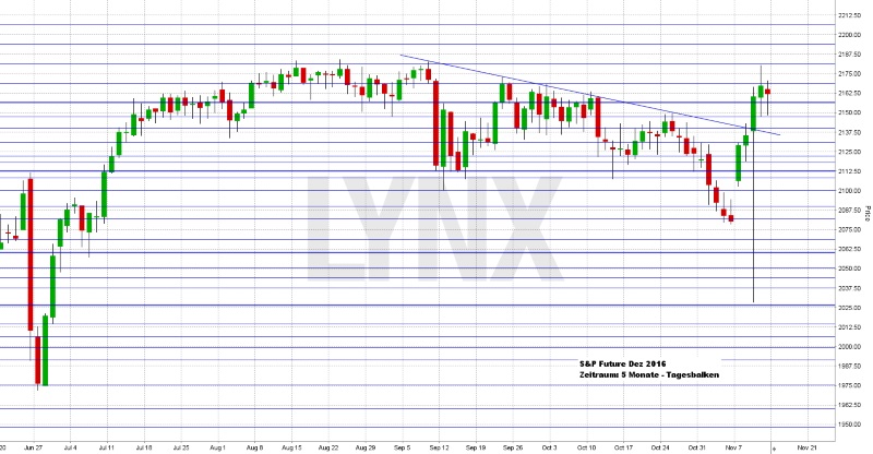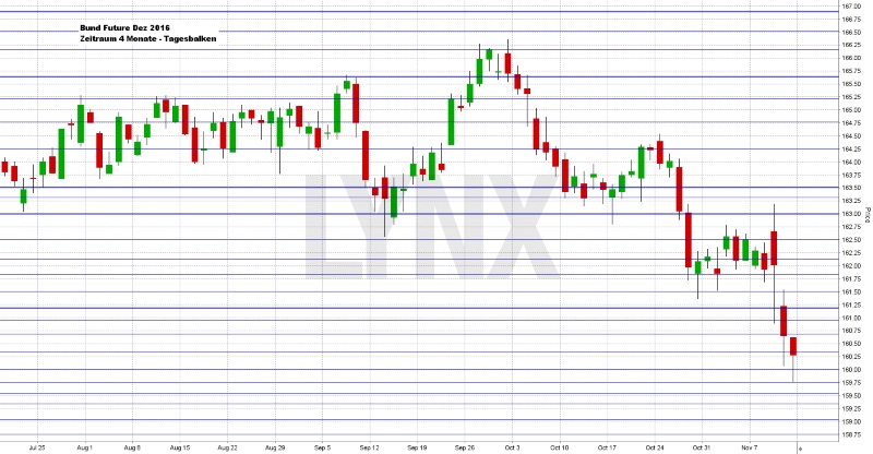Am Freitag ging der DAX mit einem Tagesplus von 0,36 Prozent bei 10.667,95 Indexpunkten aus dem Xetra-Handel. Der XDAX notierte um 22:15 Uhr bei 10.693,88 Punkten und der FDAX schloss an der EUREX mit 10.690,50 Punkten. An der Wall Street beendete der Dow Jones den Handelstag mit 18.847,66 Punkten, die neue Rekordmarke liegt hier bei 18.873,66 Punkten. Der NASDAQ 100 notierte zum Handelsschluss bei 4.751,951 Punkten, das Allzeithoch liegt bei 4.911,76 Punkten. Der breit gefasste S&P 500 schloss mit 2.164,45 Zählern, der Rekord beträgt 2.193,81 Punkte. Der Euro notierte nach US-Börsenschluss bei 1,0855 US-Dollar. Die Feinunze Gold war am Spotmarkt für 1.227,64 US-Dollar zu haben, Rohöl der Nordseesorte Brent kostete zum US-Handelsschluss im Januar-Kontrakt 44,75 US-Dollar das Fass. Der Euro-Bund-Future notierte am Freitag an der EUREX mit einem Schlusskurs von 159,98 Zählern. Die Rendite für zehnjährige Bundesanleihen liegt aktuell bei 0,31 Prozent. Der Spread zwischen zehnjährigen deutschen Bunds und zehnjährigen US-Staatsanleihen (2,15 Prozent Rendite) liegt damit bei 184 Basispunkten.