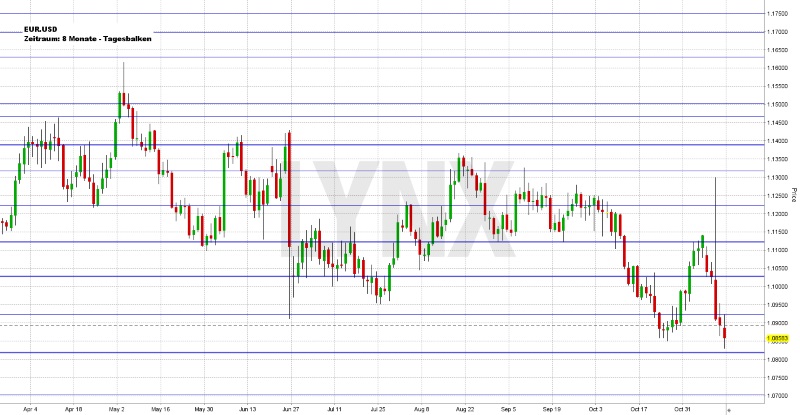 Bis zum Dienstagabend konsolidierte der EUR.USD etwas in Richtung der Unterstützung 1,1040, bevor im Laufe des Mittwochshandels eine sehr volatile Bewegung einsetzte. Zunächst stieg der Markt bis auf 1,1300, um dann im weiteren Verlauf des Tages bis auf knapp 1,0900 abzusacken. Donnerstag und Freitag ging es dann weiter leicht abwärts und es wurde ein Wochentief knapp unter 1,0850 erreicht. Der Wochenschluss lag nur geringfügig über dieser Marke. Es wird jetzt interessant, ob der EUR.USD direkt weiter fällt oder eine leichte Erholung einsetzt. Kurse unterhalb von 1,0850 wären für Verkäufe prädestiniert. Wahrscheinlicher ist jedoch eine leichte Erholung in Richtung 1,0950, wonach der Markt wieder ins Minus drehen könnte. Bei Kursen unterhalb von 1,1000 sind trendfolgende Long-Trades vorerst nicht vorteilhaft.