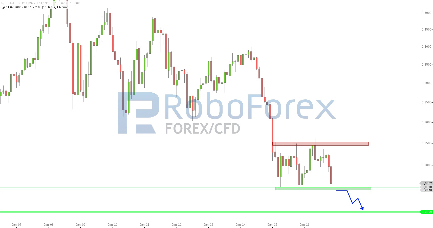 Ob diese Spekulationen am Ende ausreichen um beim EUR/USD eine Parität herbeizuführen, kann derzeit niemand wissen, da das ökonomische Umfeld eben noch unbestimmt ist. Sicherlich kann man hier von einer sich selbst erfüllenden Prophezeiung sprechen (wenn der Markt die Parität will, wird er diese auch bekommen), dieses Argument habe ich allerdings auch schon im März 2015 gehört. Prophezeiungen haben eben auch ihre Tücken und diese Tücken liegen in diesem Fall bei den o.a. übergeordneten Unterstützungen aus dem März und Dezember 2015.