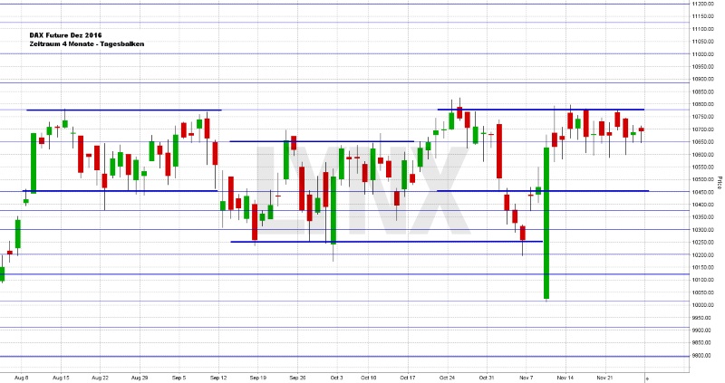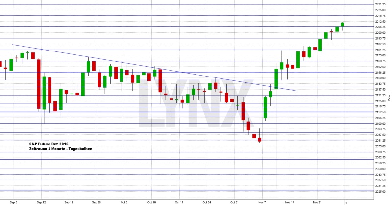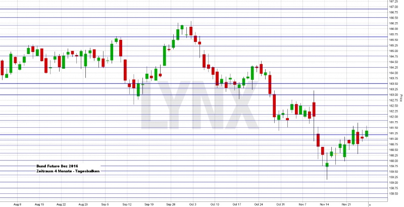 An der Wall Street wurde am Donnerstag nicht gehandelt, denn der US-Feiertag „Thanksgiving“ (Erntedankfest) wurde gefeiert. Viele US-Anleger nutzten den Freitag danach als Brückentag zum traditionellen Einkaufsrausch (Black Friday), denn am Freitag nach Thanksgiving findet an US-Börsen nur ein verkürzter Handel statt. Am Freitag beendete der Dow Jones den Handelstag mit 19.152,14 Punkten und schloss auf einem neuen Rekordstand. Der NASDAQ 100 notierte zum Handelsschluss bei 4.870,017 Punkten, die Rekordmarke liegt bei 4.911,76 Punkten. Der breit gefasste S&P 500 schloss mit 2.213,35 Zählern ebenfalls auf einem neuen Rekordniveau. Der Euro notierte zu Wochenschluss bei 1,0589 US-Dollar. Die Feinunze Gold war am Spotmarkt für 1.183,56 US-Dollar zu haben und Rohöl der Nordseesorte Brent kostete zum US-Handelsschluss im Januar-Kontrakt 47,24 US-Dollar das Fass. Der Euro-Bund-Future notierte am Freitag an der Eurex mit einem Schlusskurs von 161,48 Zählern. Die Rendite für zehnjährige Bundesanleihen liegt aktuell bei 0,24 Prozent. Der Spread zwischen zehnjährigen deutschen Bunds und zehnjährigen US-Staatsanleihen (2,36 Prozent Rendite) liegt damit bei 212 Basispunkten. In der neuen Handelswoche begibt die Finanzagentur des Bundes am 30.11.2016 Kapitalmarktinstrumente (Bobl) mit einer fünfjährigen Laufzeit und einem Emissionsvolumen von 3,0 Mrd. Euro (Aufstockung).