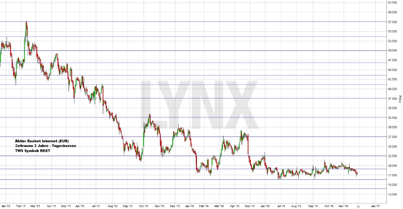 Mit Blick auf die vergangenen zwei Jahre der Aktie von Rocket Internet lässt sich ein klarer Abwärtstrend erkennen, welcher vom Hoch im Bereich 57,50 Euro bis zum Tief knapp über 16,00 Euro reicht. Leichte Anzeichen für eine Trendwende wurden schnell durch erneute Kurseinbrüche revidiert. Das Jahr 2015 war für die Aktie tiefrot und auch in diesem Jahr zeigt der Trend nach unten, auch wenn der Verlust verhältnismäßig kleiner war. In der zweiten Jahreshälfte bewegte sich der Wert mehr oder weniger nur seitwärts. Der Schlusskurs der vergangenen Handelswoche lag knapp über der Marke von 17,50 Euro. Die Vorzeichen stehen für die kommenden Wochen und Monate nicht gut. Aus charttechnischer Sicht müsste sich der Wert mindestens nachhaltig über den Widerstand von 22,50 Euro bewegen, eindeutiger wäre sogar das Überschreiten des Widerstandes von 27,50 Euro, um erneut Käufe in Erwägung ziehen zu können. Unterhalb von 22,50 Euro besteht aktuell weiterhin die Gefahr fallender Kurse und das Erreichen neuer Tiefs scheint nicht unrealistisch.