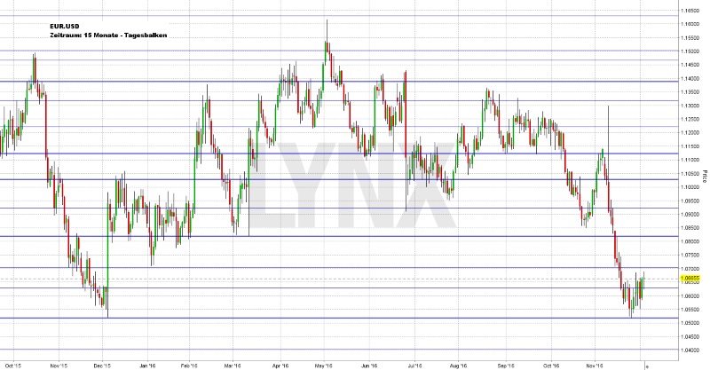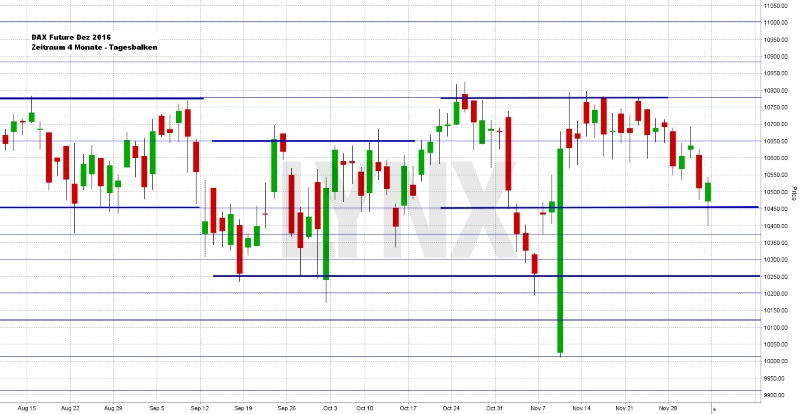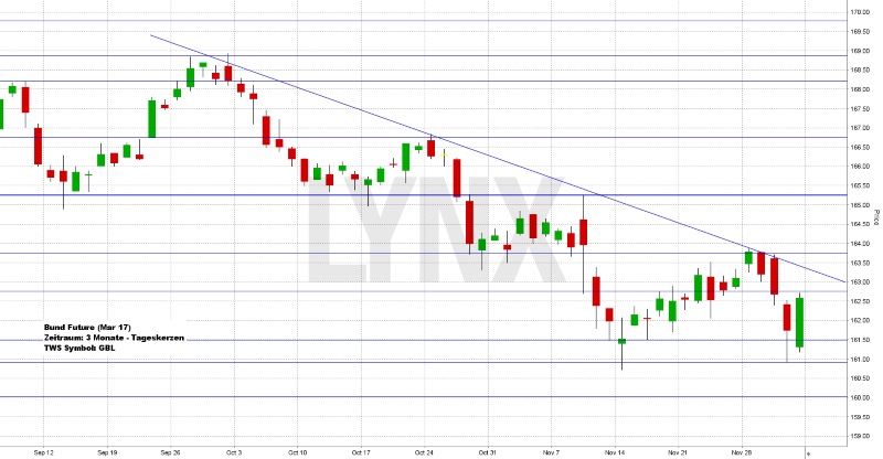 Beim deutschen Leitindex DAX standen zum Wochenschluss via Xetra 10.513,35 Punkte auf der Kurstafel. Dies entsprach einem Tagesverlust in Höhe von 0,20 Prozent. Das Handelsvolumen lag bei 2.917.970.182,00 Euro. Der XDAX notierte um 22:15 Uhr mit 10.530,99 Punkten bereits deutlich tiefer, der FDAX notierte zum Handelsschluss an der EUREX mit 10.528,50 Zählern. An der Wall Street gibt sich vor allem der Dow Jones unbeeindruckt und glänzte in der gesamten Handelswoche mit immer neuen Rekordhochs. Er schloss mit 19.170,42 Punkten, die Rekordmarke liegt aktuell bei 19.225,29 Punkten. Der NASDAQ 100 notierte zum Handelsschluss bei 4.739,372 Punkten, der Rekord beträgt 4.911,76 Punkte. Der breit gefasste S&P 500 schloss mit 2.191,95 Zählern, das Allzeithoch beträgt 2.214,10 Punkte. Der Euro notierte nach US-Börsenschluss bei 1,0664 US-Dollar. Eine Feinunze Gold war am Spotmarkt für 1.177,43 US-Dollar zu haben, Rohöl der Nordseesorte Brent kostete zum US-Handelsschluss im Februar-Kontrakt 54,46 US-Dollar das Fass. Der Euro-Bund-Future notierte am Freitag an der EUREX mit einem Schlusskurs von 161,12 Zählern. Die Rendite für zehnjährige Bundesanleihen liegt aktuell bei 0,28 Prozent. Der Spread zwischen zehnjährigen deutschen Bunds und zehnjährigen US-Staatsanleihen (2,38 Prozent Rendite) liegt derzeit bei 210 Basispunkten. In der neuen Handelswoche begibt die Finanzagentur des Bundes am Mittwoch, den 07.12.2016 Kapitalmarktinstrumente (Schatz) mit einer dreijährigen Laufzeit und einem Emissionsvolumen von 3,0 Mrd. Euro (Aufstockung).