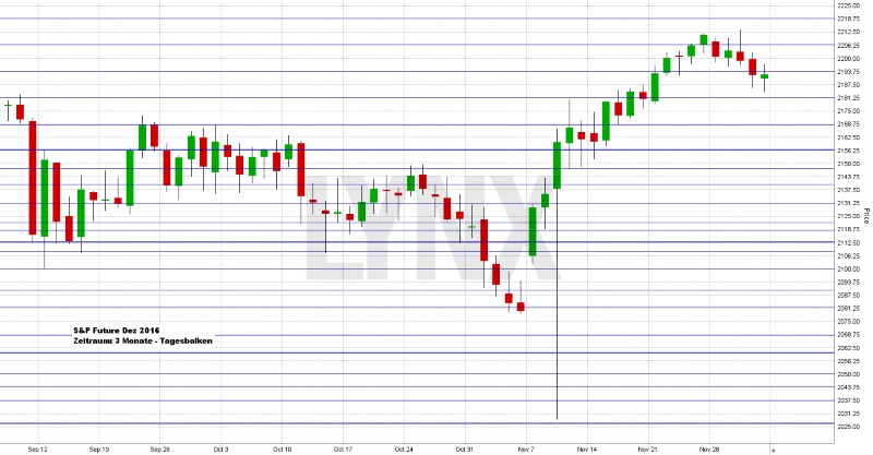 Bis Mittwoch hielt sich der S&P-Future noch oberhalb der Unterstützung von 2.193,75 Punkten und der eine oder andere Long-Trade konnte mit Gewinn abgeschlossen werden. Insgesamt setzte jedoch die erwartete leichte Korrektur ein, welche die Long-Aktivitäten etwas bremste. Der Schlusskurs von Freitagabend lag im Bereich 2.190,00 Punkte. Jetzt muss die Unterstützung von 2.181,25 Punkten im Auge behalten werden. Kurse darüber könnten nach wie vor für eine Weiterführung des Long-Trends sprechen und Käufe wären gegebenenfalls von Vorteil. Ein nochmaliges Erreichen des Bereichs 2.205,00 Punkte ist nicht ausgeschlossen. Ein nachhaltiges Absacken unter die Unterstützung von 2.181,25 Punkten könnte allerdings vorerst gegen die Long-Seite sprechen, da Kurse in Richtung 2.170,00 Punkte dann ebenfalls realistisch sind.