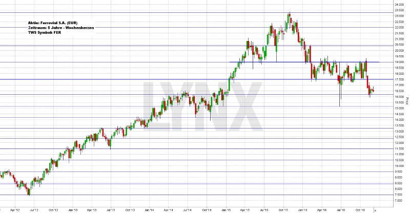 Die Ferrovial-Aktie legte von Mitte 2012 bis Ende 2015 enorm zu. Von rund 8,50 Euro ging es bis auf ein Hoch bei knapp 23,50 Euro, was einer Performance von mehr als 250 Prozent entspricht. Aus charttechnischer Sicht war diese Entwicklung verhältnismäßig sauber. Mit einem guten Stop-Management hätte ein Großteil dieser Bewegung mitgenommen werden können. Seit Ende 2015 setzte eine etwas stärkere Abwärtsbewegung ein, deren bisheriges Tief Mitte diesen Jahres bei gut 15,00 Euro erreicht wurde. Der aktuelle Schlusskurs liegt im Bereich 16,50 Euro und damit ebenfalls recht schwach. Für Käufe erscheint die aktuelle Situation eher unvorteilhaft, da sich eine Sequenz von fallenden Tiefs und fallenden Hochs abzeichnet und weitere Tiefpunkte vorerst nicht ausgeschlossen sind. Ein erstes Anzeichen erneut steigender Kurse wäre ein Überschreiten des Widerstandes von 17,50 Euro. Käufe wären allerdings gegebenenfalls erst nach einem klaren Überschreiten des Widerstandes von 19,00 Euro interessant. Ein realistisches Ziel nach oben könnte dann die Marke von 22,00 Euro darstellen.