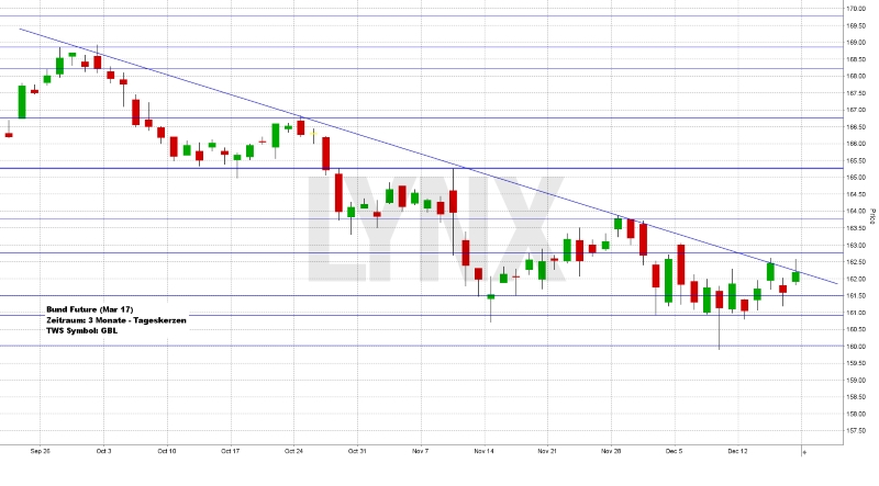 Der Bund-Future verhielt sich in der vergangenen Handelswoche etwas unsauber. Prinzipiell schaffte er es nicht, die eingezeichnete Trendlinie nachhaltig nach oben zu durchstoßen. Auf der vorteilhaften Abwärtsseite konnten trotzdem Gewinne bedingt mitgenommen werden. Lediglich ein Short-Versuch im Bereich 162,50 Punkte konnte mit einem sehr guten Ergebnis aufwarten. Der Wochenschlusskurs lag direkt auf der Trendlinie bei rund 162,20 Zählern. Man sollte aktuell vorsichtig handeln. Unterhalb der Trendlinie sollte sich der Markt weiterhin mehr auf fallende Kurse konzentrieren, wobei als Ziel vorerst lediglich die Unterstützung 161,00 realistisch ist. Erst ein aufkommendes Momentum könnte für tiefere Tiefs sorgen. Ein Überschreiten der Trendlinie und gleichzeitig des Widerstandes von 162,50 Punkten könnte für einen vorläufigen Trendbruch sprechen, wobei Käufe gegebenenfalls interessant werden könnten. Das Ziel bei 163,40 Zählern wäre für diese Überlegung durchaus nutzbar.