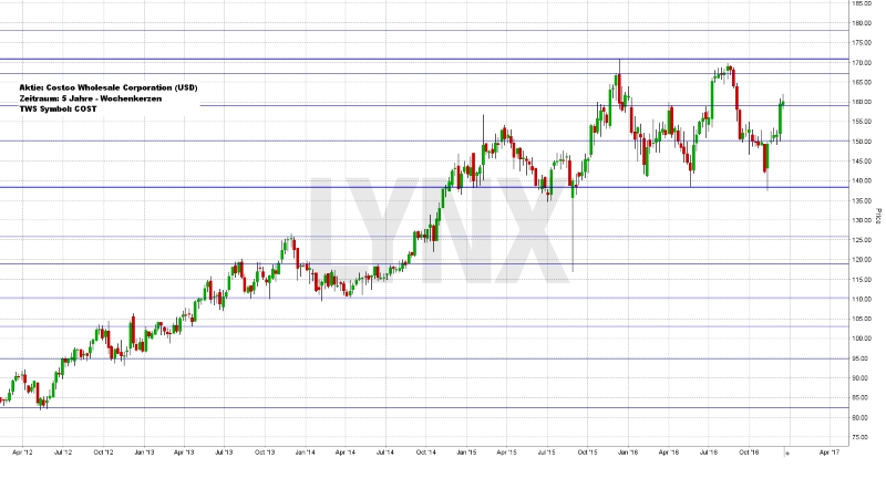In den vergangenen fünf Handelsjahren konnte sich die Aktie der Costco Wholesale Corporation recht gut entwickeln. Von rund 90,00 US-Dollar stieg sie auf rund 170,00 US-Dollar, was knapp einer Verdoppelung entspricht. Charttechnisch auffällig ist, dass sich der Wert bis zum April 2015 recht gut entwickelte, dann jedoch an Volatilität zulegte und etwas unkontrollierbarere Schwankungen vollführte. So kam es zum Beispiel in der zweiten Jahreshälfte 2015 zu einer sehr volatilen Bewegung innerhalb einer Woche von gut 135,00 US-Dollar hinab auf knapp 115,00 US-Dollar und wieder zurück. Anschließend wurden weitere neue Hochs erreicht. 2016 scheint sich eine Seitwärtsphase zu bilden, denn mehrfach schwankte der Wert zwischen den Grenzen 140,00 und 170,00 US-Dollar hin und her. Der aktuelle Schlusskurs liegt im Bereich 160,00 US-Dollar. Der Wert der Costco Wholesale Corporation steht jetzt aus charttechnischer Sicht an einer sehr interessanten Marke. Wenn man von dem durchaus realistischen Ereignis eines Long-Ausbruchs aus der Seitwärts-Range ausgeht, ergäbe ein Kauf im aktuellen Kursbereich beziehungsweise etwas tiefer ein durchaus interessantes Handelsszenario. Es könnte jedoch auch sein, dass der Wert weiterhin das Potenzial nicht ausschöpfen kann und in seiner Seitwärtsrange verharrt. Selbst in diesem Falle handelt es sich immerhin um eine Kaufmöglichkeit mit einem interessanten und berechenbaren Chance- Risiko-Verhältnis. Unterhalb von etwa 138,00 US-Dollar würde dieser Gedanke an Potenzial verlieren, da weiter fallende Kurse wahrscheinlicher werden würde. Ein realistisches Kursziel nach oben könnte derzeit die Marke von 185,00 US-Dollar darstellen.