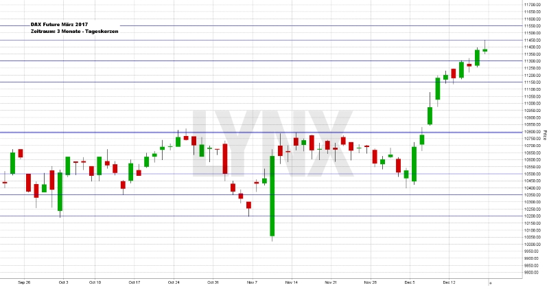 Beim deutschen Leitindex standen am Freitag mit dem Xetra-Schluss 11.404,01 Punkte auf der Kurstafel. Dies entsprach einem Gewinn von 0,33 Prozent. Die 2016er-Performance beträgt damit aktuell 6,15 Prozent Das Handelsvolumen lag am Freitag rund um den Hexensabbat bei 7.778.210.384,00 Euro und zählt damit zu den Top-Ten-Handelsvolumina des DAX von 2016. Der XDAX notierte um 22:15 Uhr mit 11.398,44 Punkten und der FDAX zum Handelsschluss an der EUREX mit 11,398,00 Zählern (März-Kontrakt). Der Dow Jones schloss mit 19.843,41 Punkten – die neue Rekordmarke liegt jetzt bei 19.966,43 Punkten. Die Jahres-Performance des Dow Jones beträgt damit 13,88 Prozent. Der NASDAQ 100 notierte zum Handelsschluss bei 4.914,864 Punkten, der Rekord beträgt 4.960,48 Punkte. Der breit gefasste S&P 500 schloss mit 2.258,07 Zählern, das Allzeithoch beläuft sich auf 2.277,53 Punkte. Der Euro notierte nach US-Börsenschluss bei 1,0451 US-Dollar. Eine Feinunze Gold war am Spotmarkt für 1.134,88 US-Dollar zu haben, Rohöl der Nordseesorte Brent kostete zum US-Handelsschluss im Februar-Kontrakt 55,21 US-Dollar das Fass. Der Euro-Bund-Future schloss am Freitag an der EUREX mit 162,04 Zählern. Die Rendite für zehnjährige Bundesanleihen liegt aktuell bei 0,31 Prozent. Der Spread zwischen zehnjährigen deutschen Bunds und zehnjährigen US-Staatsanleihen (2,59 Prozent Rendite) liegt derzeit bei 228 Basispunkten.