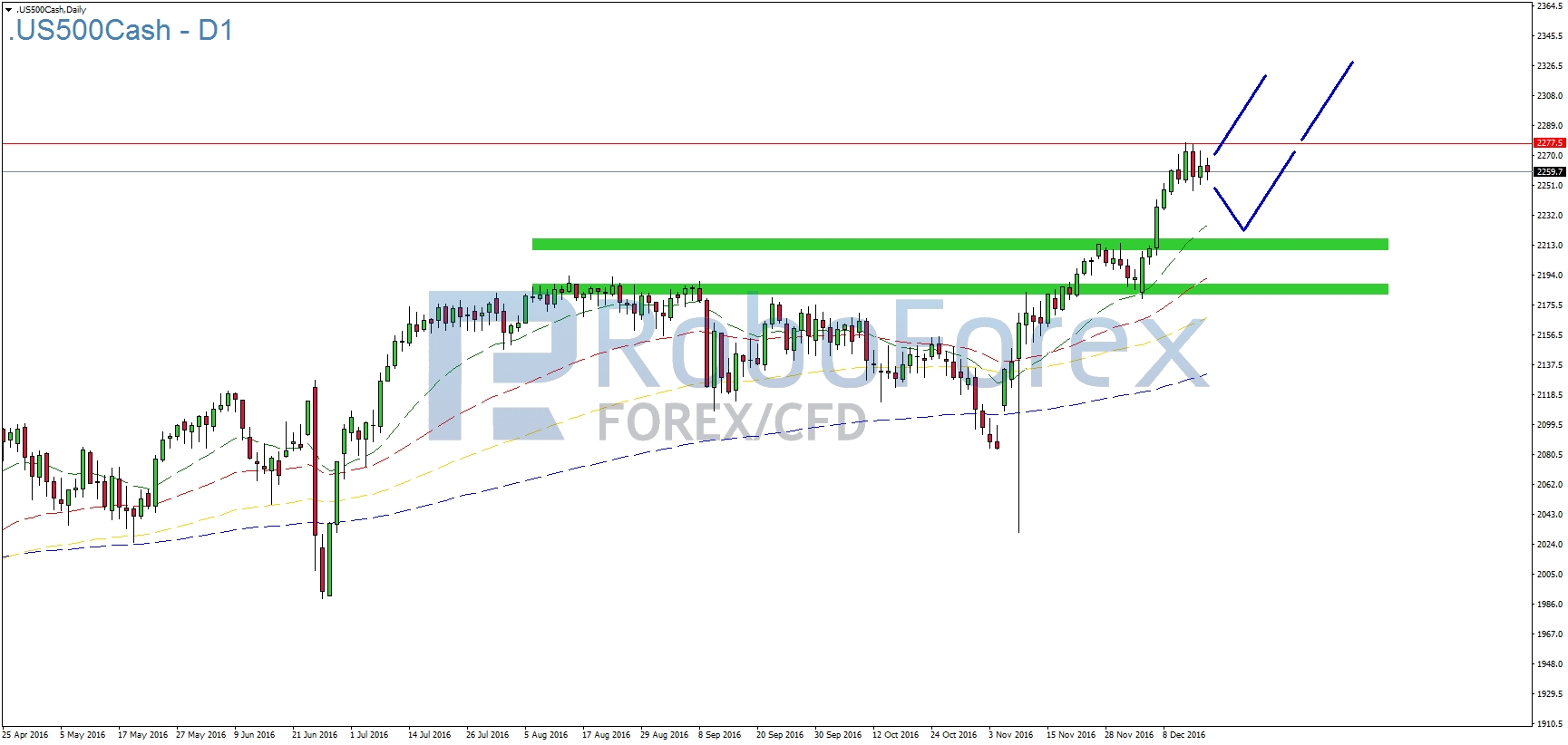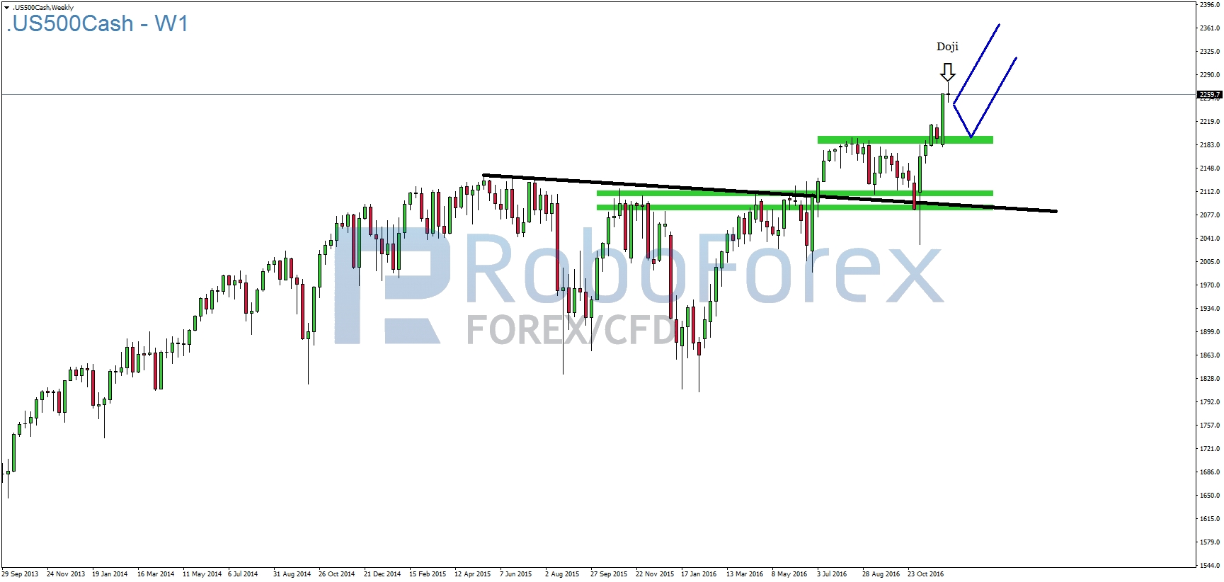 Dabei verzeichnete der S&P 500 in der vergangenen Handelswoche sein neues Allzeithoch bei 2.277 Punkten. Im Vergleich zu den Wochen nach der US-Wahl verlor der S&P 500 in der vergangenen Woche allerdings etwas Dynamik und ging mit knapp 2.260 Punkten ins Wochenende. Diese Entwicklung wird im Wochenchart durch einen Doji als letzte Wochenkerze gekennzeichnet.