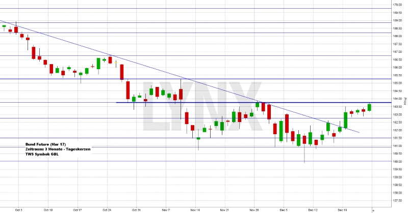 Das Szenario des vorläufigen Bruchs der eingezeichneten Trendlinie konnte in der vergangenen Handelswoche recht gut in interessante Trades umgewandelt werden und mit dem Erreichen des angepeilten Ziels von 163,40 Punkten ergaben sich mehrfach positive Trades. Das Wochenhoch und auch der Wochenschlusskurs lagen etwas über dem Wochenziel im Bereich 163,75 Punkte. Kleinere Rücksetzer an Unterstützungen boten die interessantesten Einstiege. Der Bereich des Vorwochenschlusskurses und -hochs stellt wie eingezeichnet einen etwas stärkeren Widerstand dar, welcher in der kommenden Handelswoche im Fokus stehen sollte. Ein schneller, nachhaltiger Durchbruch könnte gegebenenfalls zügig für Kurse im Bereich 165,00 Punkte sorgen und Käufe wären durchaus denkbar. Etwas wahrscheinlicher ist jedoch ein vorläufiger leichter Rücklauf als Anlauf zum Durchbruch des Widerstandes. Vorsichtige Käufe an Unterstützungen oberhalb von 162,50 Punkten wären somit ebenfalls denkbar. Kurse unterhalb von 162,50 Zählern würden den Markt in einen leichten Seitwärtsbereich zurückversetzen und Handlungen wären für die letzten Handelstage des Jahres dann kaum noch interessant.