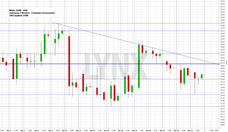 Die Aktie von CSRA tendierte in den vergangenen Handelswochen primär seitwärts. Zwischen den Kursbereichen bei 32,85 US-Dollar und 31,30 US-Dollar gab es ein mehrfaches Auf und Ab. Auffällig sind zwei recht starke Momentum-Bewegungen am 12. und 19. Dezember, welche den Wert einmal etwas stärker nach unten und einmal etwas stärker nach oben trieben. Die Mittelachse der Seitwärtszone bildet etwa der Kursbereich um 32,10 US-Dollar – der Schlusskurs von Freitagabend lag knapp darunter bei rund 31,90 US-Dollar. Durch die Seitwärtszone ergibt sich generell ein aus trendfolgender Sicht eher uninteressantes Chart-Bild, da ausnutzbare Handelsvorteile rar sind. Wie zu beobachten war, sind Kursverläufe mehr zufälliger Natur und springen schnell hin und her. Sollten dennoch Kaufabsichten bestehen, so wäre zunächst das Überschreiten des Widerstandes von 32,10 US-Dollar und ein damit verbundenes Überschreiten der eingezeichneten Trendlinie abzuwarten. Kursziele in Richtung 32,60 US-Dollar und bestenfalls in Richtung der oberen Seitwärtszonengrenze bei 32,80 US-Dollar wären in den kommenden Handelstagen bedingt realistisch. Unterhalb von 32,10 US-Dollar wäre ein weiteres Absacken ebenfalls denkbar.