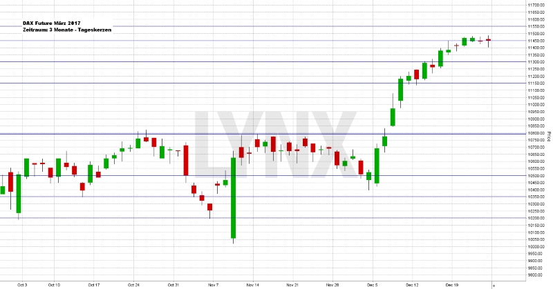Der DAX-Future punktete in den vergangenen Handelstagen erneut auf der Aufwärtsseite, wobei das Momentum und auch die Volatilität im Vergleich zu den Vorwochen wie erwartet weiter rückläufig waren. Zwischen dem Wochentief im Bereich 11.375 Punkte und dem Wochenhoch bei rund 11.490 Punkten lagen gerade einmal gut 100 Punkte – eine Bewegungsamplitude, welche in den Vorwochen teilweise an nur einem Vormittag absolviert wurde. Der Bereich 11.450 Punkte war augenscheinlich die am stärksten frequentierte Marke, was auch durch den Schlusskurs in diesem Bereich unterstrichen wird. Die Wahrscheinlichkeit ist recht hoch, dass sich die saisonbedingte geringe Volatilität auch bis zum Jahresende fortsetzt. Oft fehlen einfach Anstöße, um den Markt etwas stärker in Bewegung zu versetzen. Charttechnisch sind nochmals neue Hochs und auch ein Absacken in Richtung 11.300 Punkte nicht auszuschließen. Recht wahrscheinlich ist jedoch eine anhaltende Stärke, die die Chance auf Käufe eröffnen würde. Ein Schlusskurs nahe dem Jahreshoch ist realistisch.