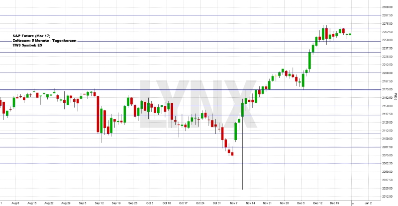 Der S&P-Future tendierte in der vergangenen Handelswoche weiterhin überwiegend long, wobei kein neues Allzeithoch mehr erreicht wurde. Die Volatilität ging merklich zurück, was die Handlungen generell etwas konservativer werden ließ. Die Abwärtsseite war jedoch wie erwartet keine interessante Option. Der Wochenschluss lag nahe dem Schlusskurs der Vorwoche im Bereich 2.257 Punkte. Es ist aktuell recht wahrscheinlich, dass der Rückgang der Volatilität auch in den kommenden Tagen anhält, was zu bescheidenen Zielen mahnt. Die Aufwärtsseite ist jedoch aus charttechnischer Sicht weiterhin die interessantere Seite und ein nochmaliges Erreichen und möglicherweise leichtes Überschreiten des Jahreshochs ist nicht auszuschließen. Generell sollte vorsichtig gehandelt werden.