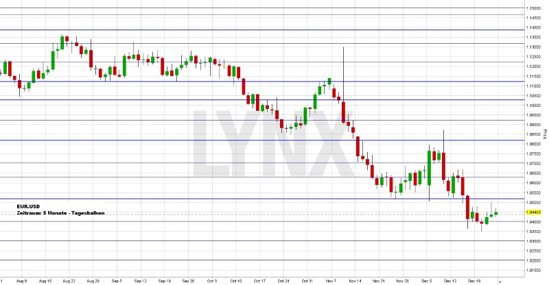 Der EUR.USD schaffte es zu Beginn der vergangenen Handelswoche wie erwartet, nochmals die Tiefs der vorletzten Handelswoche zu erreichen, und markierte sogar noch ein geringfügig tieferes neues Tief. Ab Dienstag setzte eine kleine Erholung ein, welche den Markt bis auf 1,0500 führte. Vorsichtige Verkäufe an Widerständen konnten trotzdem mit leichten Gewinnen abgeschlossen werden. Der Schlusskurs von Freitagabend lag im Bereich 1,0450. Das Szenario der Vorwoche könnte jetzt fast Eins zu Eins auch für die letzten Handelstage des Börsenjahres 2016 übernommen werden. Kurse unterhalb von 1,0550 sollten weiterhin eher von der Abwärtsseite aus betrachtet werden. Nochmals sind etwas tiefere Tiefs beziehungsweise das Erreichen des Bereichs 1,0375 ein realistisches Ziel. Ebenfalls möglich wäre aber auch eine Seitwärtstendenz, was zu einer generellen Vorsicht vor übereifrigen Handlungen führen sollte.