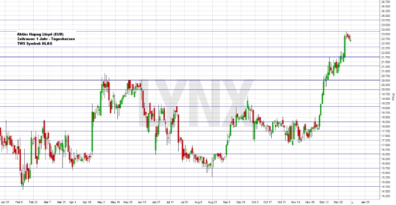 Im vergangenen Handelsjahr war für die Hapag-Lloyd-Aktie bis Ende November lediglich eine etwas volatilere Seitwärtsphase zu beobachten, die für trendfolgende Handlungen nur bedingt interessant war. Der Wert schwankte innerhalb der Range von rund 15,00 Euro bis gut 20,50 Euro. Erst im Dezember konnte die Aktie etwas Fahrt nach oben aufnehmen und stieg mit sehr sauberen Schritten bis knapp vor die Marke von 23,50 Euro. Diese Trendtendenz der letzten Handelswochen könnte sich weiter fortsetzen, was Gedanken an Käufe durchaus unterstützt. Kurse oberhalb von 21,75 Euro und etwas langfristiger gesehen auch oberhalb von 20,50 Euro wären charttechnisch sauber im Longtrend, weitere Hochs wären durchaus realistisch. Erst ein Absacken unter die Unterstützung 20,50 Euro käme der Aufwärtsseite in die Quere. Käufe sollten dann etwas zurückgenommen werden. Eine erneute Analyse mit dem Blick auf das sich dann ergebende Bild ist anzuraten.