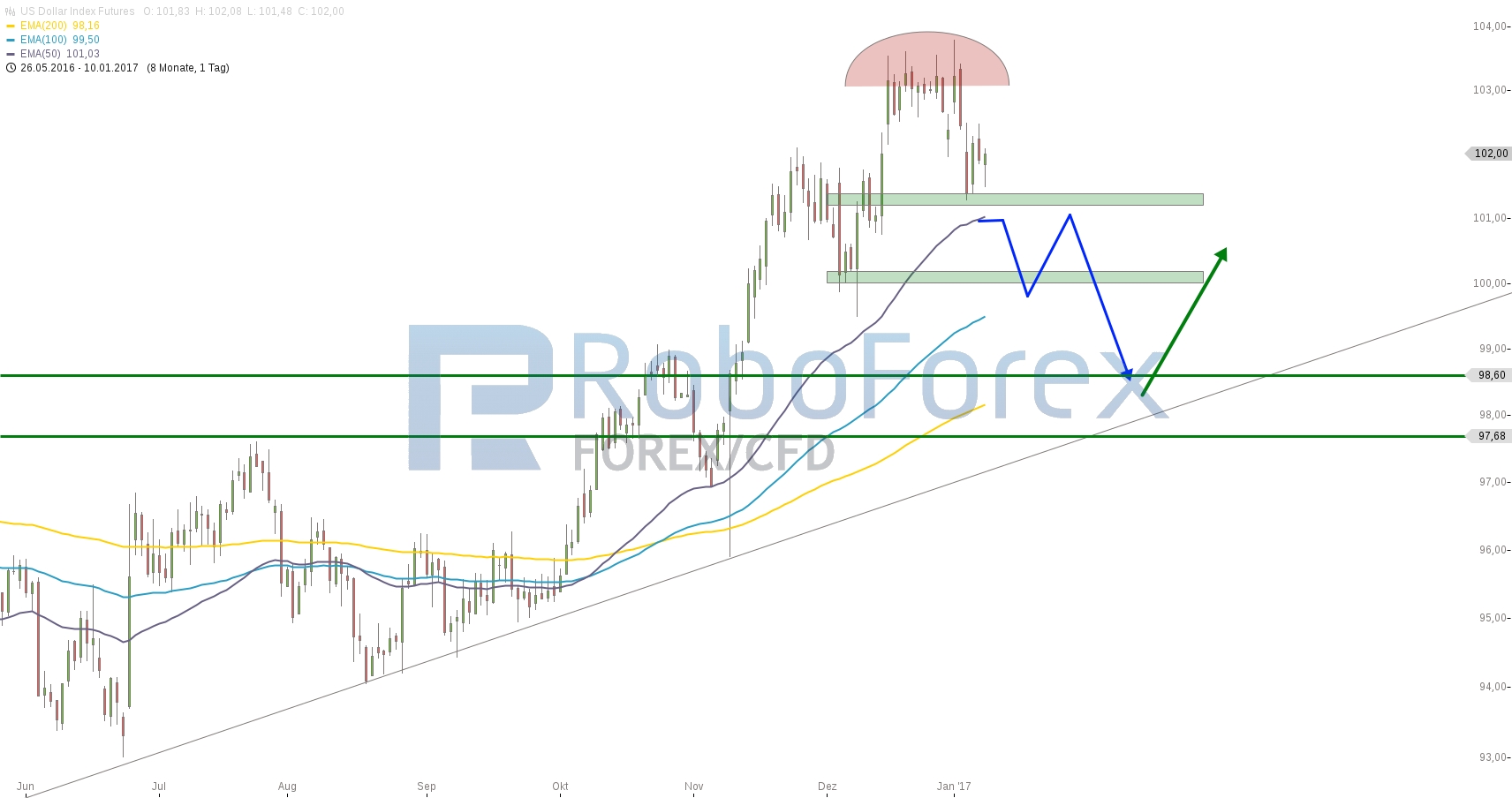 Bei einem Rücksetzer an die Unterstützungszone bei 100,- Punkten besteht für den US Dollar Index die Gefahr einer übergeordneten Topformation in Form einer Schulter-Kopf-Schulter Formation. Dieses Szenario ist in blau dargestellt. Dennoch bliebe das Marktmuster weiterhin bullish, solange die Aufwärtstrendlinie in grau verteidigt wird (grüner Pfeil).