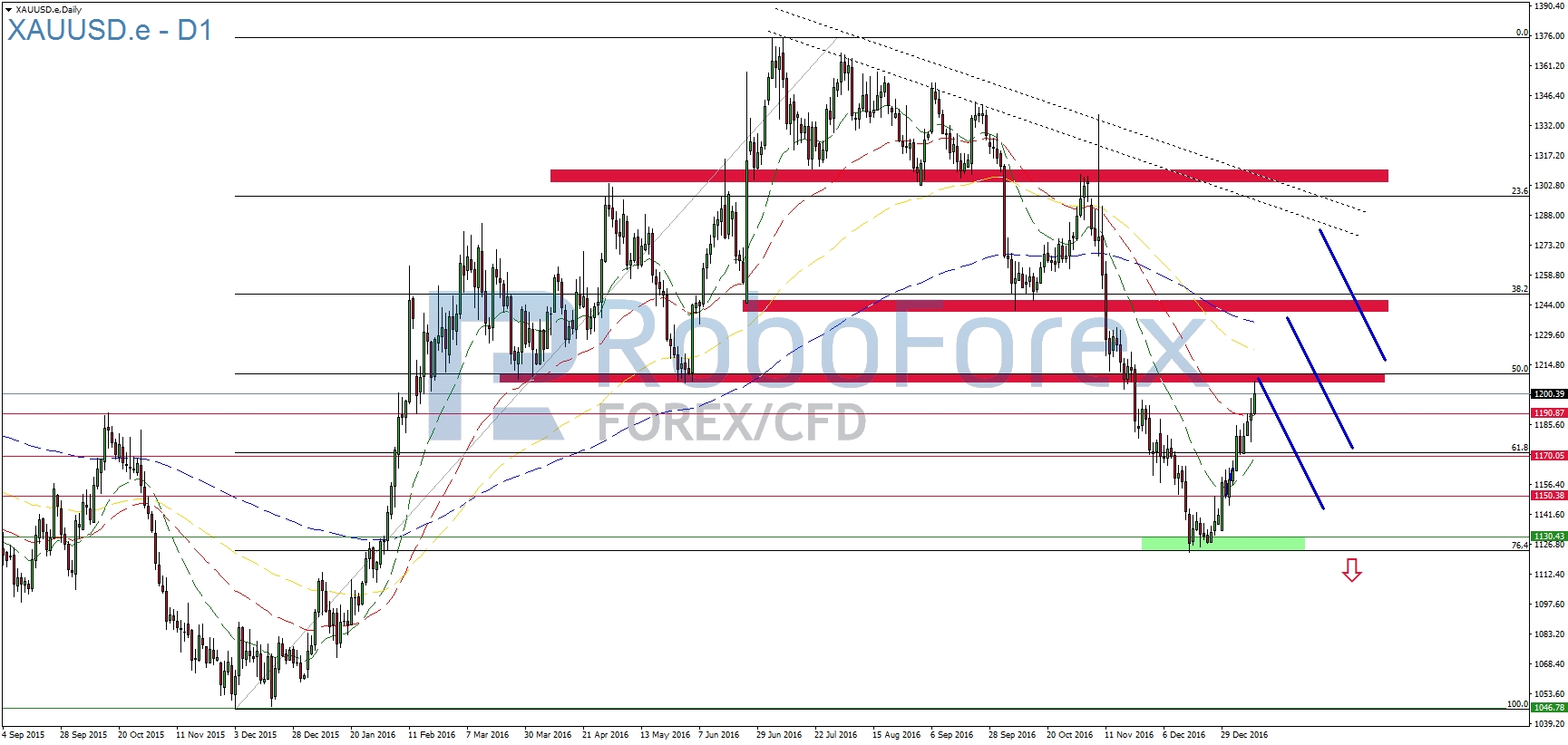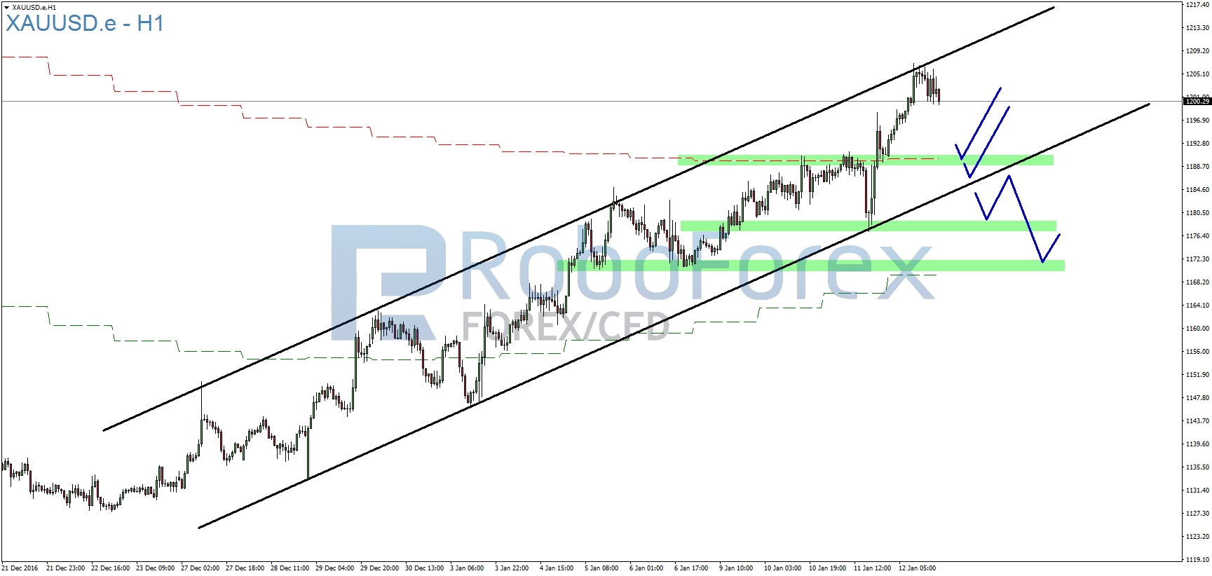 Hierbei ist zunächst die zuvor durchbrochene 50er-EMA bei 1.190,- USD zu nennen. Direkt darunter wartet die untere Trendkanalsbegrenzung als weitere Unterstützung. Sollte es hier zu einem Bruch kommen, stünden bei 1.177,- USD und 1.170,- USD weitere Unterstützungen bereit.