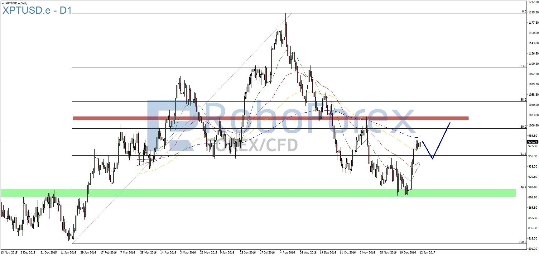 Platin profitierte ebenfalls von der anhaltenden Stärke im Sektor und bestätigte die Bodenbildung im Unterstützungsbereich von 897,- USD. Wie auch Gold und Silber setzte Platin die eingeleitete Aufwärtsbewegung fort und überwand am gestrigen Handelstag auch den übergeordneten Widerstand in Form von der 200er-EMA (blau gestrichelt) bei 985,- USD.