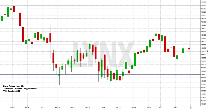 Am Freitag standen beim deutschen Leitindex DAX zum Xetra-Schluss 11.629,18 Punkte auf der Kurstafel. Das entspricht einem Tagesgewinn von 0,94 Prozent. Das Handelsvolumen lag bei 2.948.283.377,00 EUR. Der XDAX notierte um 22:15 Uhr mit 11.616,23 Punkten und der FDAX notierte zum Handelsschluss an der EUREX mit 11.613,50 Zählern. Der Dow Jones schloss mit 19.885,73 Punkten und die Rekordmarke liegt bei 19.999,63. Der NASDAQ 100 notierte zum Handelsschluss bei 5.059,51 Punkten, die neue Rekordmarke steht bei 5.066,95 Punkten. Der breit gefasste S&P 500 schloss mit 2.274,64 Zählern, der Rekord beträgt 2.282,10 Punkte. Der Euro notierte nach US-Börsenschluss bei 1,0643 US-Dollar. Eine Feinunze Gold wurde am Spotmarkt für 1.197,34 US-Dollar gehandelt. Rohöl der Nordseesorte Brent kostete zum US-Handelsschluss im März-Kontrakt 55,45 US-Dollar das Fass. Der Euro-Bund-Future schloss am Freitag an der EUREX mit 163,56 Zählern. Die Rendite für zehnjährige Bundesanleihen liegt aktuell bei 0,33 Prozent. Der Spread zwischen zehnjährigen deutschen Bunds und zehnjährigen US-Staatsanleihen (2,40 Prozent Rendite) liegt derzeit bei 207 Basispunkten. Am Dienstag, den 17.01.2016 plant die Finanzagentur des Bundes die Emission von Kapitalmarktinstrumenten (Schatz) mit einem avisierten Emissionsvolumen in Höhe von 5,0 Mrd. Euro. Es handelt sich um eine Aufstockung.