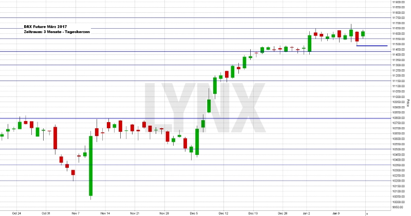 Die britischen BRC-Einzelhandelsumsätze im Dezember eröffnen um 01:01 Uhr den Freitag. Es folgen die deutschen Erzeugerpreise Dezember um 08:00 Uhr und die britischen Dezember-Einzelhandelsumsätze um 10:30 Uhr. An der EUREX verfallen um 13:00 Uhr Optionen auf Aktien und Optionen auf den DAX (kleiner Verfallstag). Um 14:30 Uhr folgen die kanadischen Einzelhandelsumsätze und Verbraucherpreise im Dezember und um 16:00 Uhr wird das Verbrauchervertrauen für die Eurozone im Januar publiziert. Um 19:00 Uhr wird die Anzahl der US-Ölbohrplattformen (Rig Count) von Baker Hughes ausgegeben und kurz vor US-Börsenschluss wird um 21:30 Uhr noch der CoT-Bericht der CFTC publiziert. Die grafisch aufbereiteten COT-Daten bekommen Anleger auf der Seite Commitments of Traders Report von LYNX tagesaktuell zur Verfügung gestellt. Rund 30 Unternehmen berichten von ihren Quartals- und Jahresergebnissen, darunter Rockwell Collins (US), General Electric (US) und MB Financial. In Washington legt Donald Trump als 45. Präsident der USA seinen Eid auf die Verfassung ab. Die offizielle Amtseinführungszeremonie auf dem Capitol Hill gilt als Medienereignis.