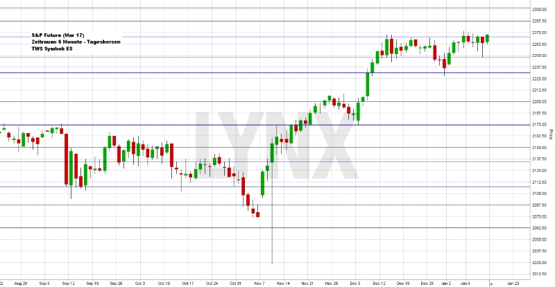 Der S&P-Future bot in der vergangenen Handelswoche ein Bilderbuchszenario, das zu einem nahezu perfekten Trade führte. Am Donnerstag sackte der Markt zur Eröffnung in Richtung der Unterstützung von 2.250 Punkten ab, um kurz darauf zu einem fulminanten Rebound in Richtung der Tageseröffnung anzusetzen. Ein Kauf an der Unterstützung, der bereits am Sonntag geplant wurde, konnte zu einem idealen Gewinntrade umgewandelt werden. Der Schlusskurs zum Freitagabend lag im Bereich von 2.270 Punkten. Der S&P-Future zeigt offenbar weiterhin Stärke. So bleibt auch in der kommenden Handelswoche die Aufwärtsseite im Vordergrund. Weitere Allzeithochs sind nicht auszuschließen. Allerdings sollten Ausbruchstrades über die bisherigen Hochs weniger genutzt werden. Vorangegangene Rücksetzer sind gegebenenfalls eine bessere Wahl für den Kauf. Kurse unterhalb der Unterstützung von 2.250 Punkten sind eventuell ein erstes Warnzeichen für die Longseite, Käufe sollten vorerst zurückgenommen werden.