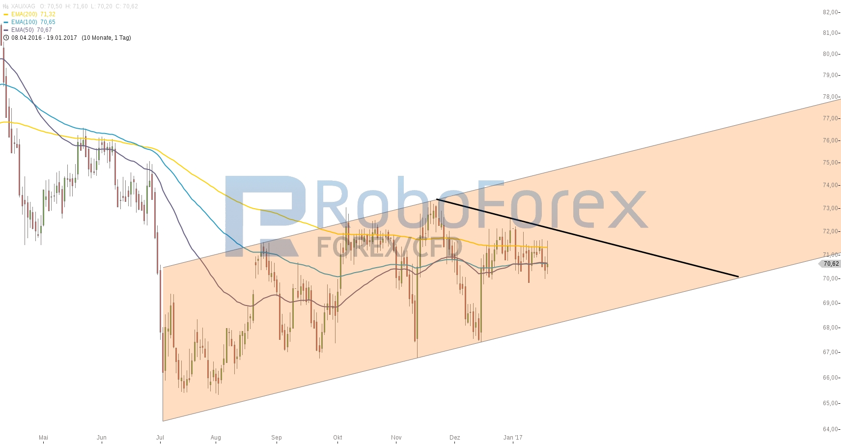 Gold und Silber befinden sich nach ihren Tiefs aus Dezember 2016 nach wie vor in einer intakten Erholungsrally. Zuletzt hatte diese Rally Gold an die 100er-EMA bzw. auf ein Achtwochenhoch geführt. Eine wichtige Rolle für die Erholung spielte hier zuletzt der schwächer notierende US-Dollar, welcher nach der Trump-Rally etwas geschwächelt hatte. Aussagen Trumps, dass der starke US-Dollar Gift für die amerikanische Wirtschaft seien, wirkten sich ebenfalls positiv auf die Edelmetallpreise aus. Dem setzte die FED-Vorsitzende Janet Yellen gestern allerdings entgegen, dass die US-Wirtschaft bereit für steigende Zinsen sei. Hier scheint sich daher ein spannender Schlagabtausch zu entwickeln, der auch einen größeren Einfluss auf die künftige Kursentwicklung bei Gold und Silber haben dürfte.