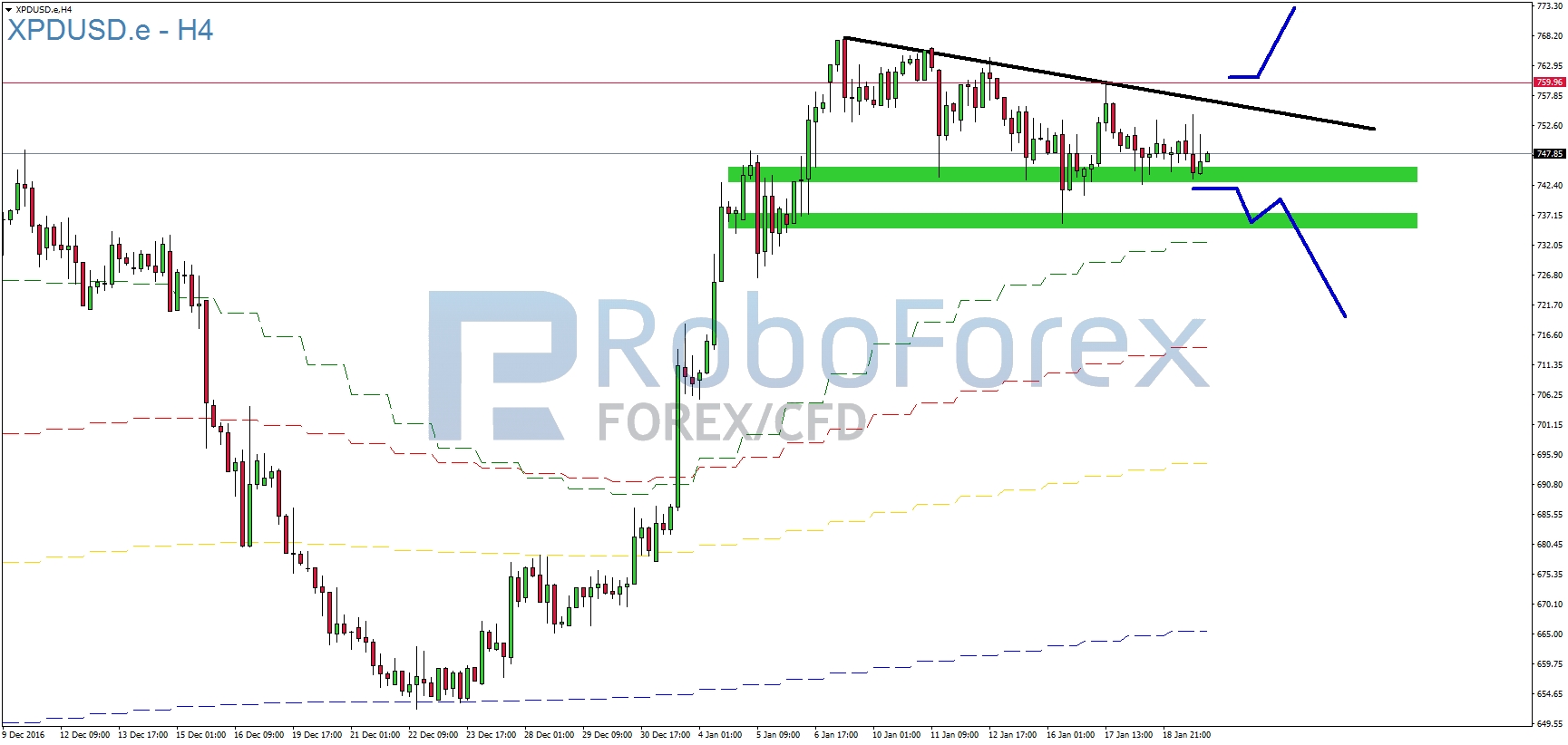 Für eine Fortsetzung der Aufwärtsbewegung wäre ein Bruch der temporären Abwärtstrendlinie notwendig. Im Anschluss sollte Palladium zügig über 760,- USD ansteigen, um die bullishe Trendfortsetzung zu bestätigen.