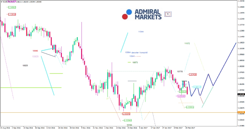 Der EUR/USD ist in den letzten Handelstagen unter Druck gekommen. Zum einen erscheint es wahrscheinlich, dass die Fed bei der nächsten Sitzung die Leitzinsen erneut leicht anheben könnte. Zum anderen spielen die politischen Unsicherheiten in Europa eine Rolle. In wichtigen Ländern stehen in diesem Jahr Wahlen an. Insbesondere der Frankreich-Wahl kommt hohe Bedeutung zu. Gewinnen hier die populistischen Nationalisten, dürfte dies die EU und den EUR/USD in eine schwierige Situation bringen. Das gesamte Umfeld spricht aktuell dafür, dass es übergeordnet eher an die Parität als an die 1,10 geht.