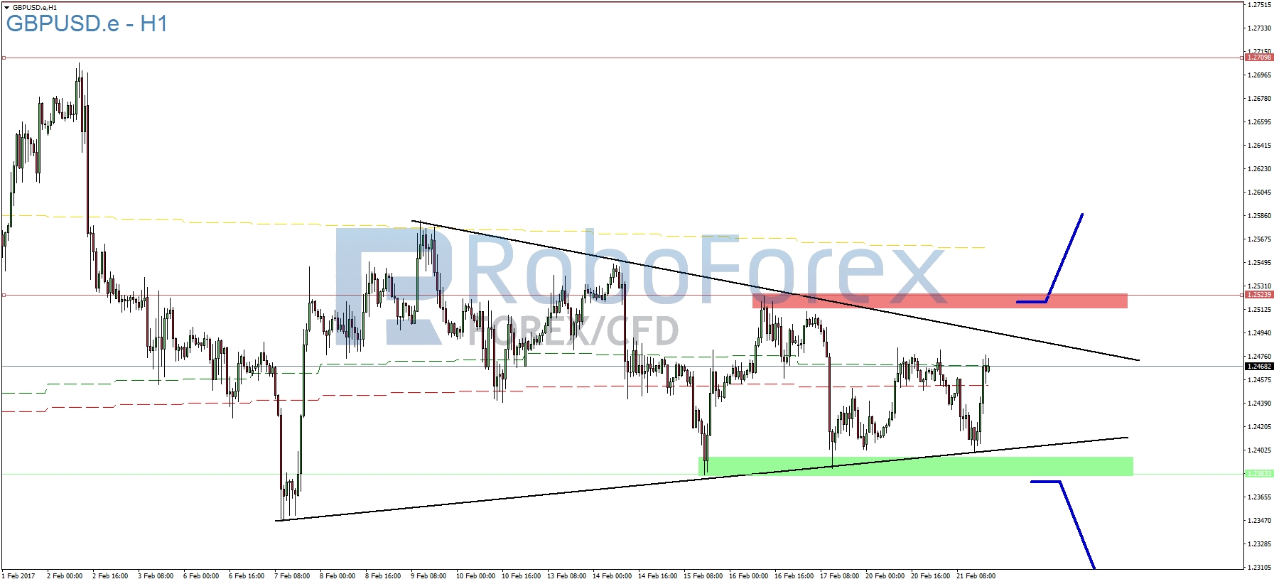 Im Stundenchart hat das Währungspaar GBP/USD eine Dreiecksformation ausgebildet. Diese Formation befindet sich fast mittig in der Seitwärtsrange, sodass ein Ausbruch aus dieser Formation weiteren Aufschluss darüber geben dürfte, ob der Widerstandsbereich bei 1,2780 USD oder der Unterstützungsbereich bei 1,1985 USD wieder auf die Agenda rückt.