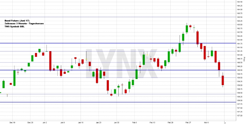 Wie angenommen hat sich der Bund-Future weiter nach unten entwickelt und eine leichte Erholung zu Wochenbeginn sorgte für ein ideales Einstiegsszenario. Ab Mittwoch setzte eine Fortsetzung der Abwärtsbewegung ein und verhalf dem Markt zu einem Wochentief im Bereich um die Marke von 159,00. Die Überlegung, eventuell den Bund zu kaufen, konnte nicht umgesetzt werden, da der Widerstand von 161,75 Punkten nicht überwunden werden konnte. Aus charttechnischer Sicht sind die Tiefs von Ende Januar jetzt in greifbarer Nähe und könnten als realistisches Ziel angenommen werden. Kurse unterhalb von 160,00 sind weiterhin klar im Abwärtstrend und Verkäufe sind eine denkbare Option. Ein Überschreiten des Widerstandes von 160,00 könnte zu einer etwas ausgedehnteren Erholung führen, Verkäufe sollten etwas zurückgenommen werden. Käufe bieten sich aus aktueller Sicht gerade nicht an.