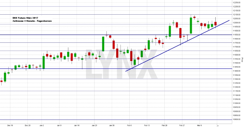 Beim deutschen Leitindex DAX standen am Freitag mit dem Xetra-Schluss 11.963,18 Punkte auf der Kurstafel. Das Handelsvolumen via Xetra und Börse Frankfurt betrug 3,579 Mrd. EUR. Die 12.000-Punkte-Marke konnte auch nachbörslich nicht gehalten werden. Am Donnerstag tagte die EZB, bot dem Markt jedoch keine wesentlichen Gründe für dauerhafte Kursschübe. Die starken US-Arbeitsmarktdaten vom Freitag lieferten der Fed einen Grund, den US-Leitzins um weitere 25 Basispunkte anzuheben. Der XDAX notierte um 22:15 Uhr mit 11.951,56 Punkten, der FDAX notierte zum Handelsschluss an der EUREX mit 11.950,00 Zählern. Der Dow Jones schloss mit 20.902,98 Punkten, die Rekordmarke liegt bei 21.169,11 Punkten. Der NASDAQ 100 notierte zum Handelsschluss bei 5.385,90 Punkten, der Rekord beträgt 5.398,43 Punkte. Der breit gefasste S&P 500 schloss mit 2.372,60 Zählern, der Rekord beträgt 2.400,98 Punkte. Der Euro notierte nach US-Börsenschluss bei 1,0673 US-Dollar. Eine Feinunze Gold war am Spotmarkt für 1.204,64 US-Dollar zu haben, Rohöl der Nordseesorte Brent kostete zum US-Handelsschluss im Mai-Kontrakt 51,37 US-Dollar das Fass. Der Euro-Bund-Future schloss am Freitag an der EUREX mit 159,03 Zählern. Die Rendite für zehnjährige Bundesanleihen liegt aktuell bei 0,48 Prozent. Der Spread zwischen zehnjährigen deutschen Bunds und zehnjährigen US-Staatsanleihen (2,57 Prozent Rendite) liegt somit bei 209 Basispunkten. In der neuen Handelswoche plant die Finanzagentur des Bundes am Montag, den 13.3., die Emission von Geldmarktinstrumenten (Bubill) mit einer sechsmonatigen Laufzeit und einem avisierten Emissionsvolumen in Höhe von 2,0 Mrd. Euro (Neuemission) und am Mittwoch, den 15.3., die Emission von Kapitalmarktinstrumenten (Bund) mit einer dreißigjährigen Laufzeit und einem avisierten Emissionsvolumen in Höhe von 1,0 Mrd. Euro (Aufstockung).