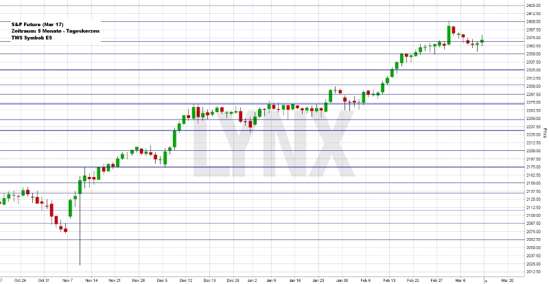Das angenommene Szenario leicht abrutschender Kurse in Richtung der 2.350,00-Punkte-Marke konnte der S&P Future in der vergangenen Handelswoche erfüllen. Eine etwas konservativere Kaufstrategie war die beste Wahl. Das Wochentief lag nur knapp über der Unterstützung von 2.350,00, das Wochenhoch im Bereich der 2.380,00 Punkte. Der Wochenschlusskurs lag nahe der Marke von 2.372,00 Punkten. Vorsichtig könnte jetzt in den kommenden Handelstagen erneut auf die Aufwärtsseite gesetzt werden, wobei ein Test der Unterstützung von 2.340,00 weiterhin in Betracht gezogen werden sollte. Diese eventuelle zweite Korrektur wäre nahezu ideal für eine Fortsetzung der Aufwärtsseite. Die Abwärtsseite ist aus aktueller Sicht noch nicht interessant, lediglich ein merkliches Abwärtsmomentum könnte für ein oder zwei Shortversuche sprechen.