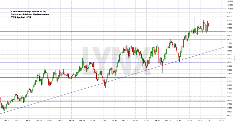 Die Aktie von Heidelberg Cement konnte sich in den vergangenen fünf Handelsjahren recht gut entwickeln und trendfolgende Strategien waren eine gute Wahl für dauerhafte Gewinne. Von rund 35 Euro ging es kürzlich auf rund 95 Euro hinauf, was einem Zuwachs von rund 170 Prozent entspricht. Während dieser Entwicklung kam es mehrfach zu interessanten Kursrücksetzern, die als potenzielle Einstiegspunkte gelten konnten. Nach dem Ende 2016 ausgebauten Hoch gab der Wert erneut leicht nach und bewegte sich zum Ende der vergangenen Handelswoche im Bereich um die Marke von 90 Euro. In der weiteren Entwicklung des Wertes sind aus charttechnischer Sicht weitere Hochs in Richtung der 100-Euro-Marke nicht auszuschließen. Käufe oberhalb der Unterstützung von 80 Euro wären somit eine durchaus denkbare Wahl für Einstiege. Ideal wäre ein erneuter leichter Rücksetzer in Richtung 87 Euro. Sollte der Wert jedoch unter die eingezeichnete Unterstützung von 80 Euro fallen, wären Käufe vorerst etwas uninteressanter und Handlungen sollten zurückgenommen werden.