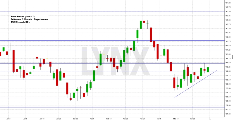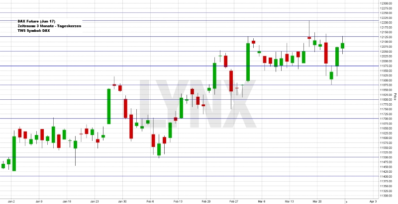 Der deutsche Leitindex DAX ging am Freitag mit 12.064,27 Punkten aus dem Xetra-Handel. Er legte um 24,59 Indexpunkte zu – dies entspricht einem Tagesgewinn von 0,20 Prozent. Das Jahreshoch liegt bei 12.156,44 Punkten und das Handelsvolumen bei 3,151 Mrd. EUR – das ist im Vergleich zum Hexensabbat vom 17.3.nur gut die Hälft. Der XDAX notierte um 22:15 Uhr mit 12.077,81 Punkten, der FDAX notierte zum Handelsschluss an der EUREX mit 12.105,50 Zählern. Der Dow Jones schloss mit 20.596,72 Punkten und die Rekordmarke liegt bei 21.169,11 Punkten. Der NASDAQ 100 notierte zum Handelsschluss bei 5.363,995 Punkten, der Rekord beträgt 5.439,58 Punkte. Der breit gefasste S&P 500 schloss mit 2.343,98 Zählern und die Rekordmarke liegt hier bei 2.400,98 Punkten. Der Euro notierte nach US-Börsenschluss bei 1,0798 US-Dollar. Eine Feinunze Gold war am Spotmarkt für 1.243,57 US-Dollar zu haben, Rohöl der Nordseesorte Brent kostete zum US-Handelsschluss im Mai-Kontrakt 50,80 US-Dollar das Fass. Der Euro-Bund-Future schloss am Freitag an der EUREX mit 160,24 Zählern. Die Rendite für zehnjährige Bundesanleihen liegt aktuell bei 0,40 Prozent. Der Spread zwischen zehnjährigen deutschen Bunds und zehnjährigen US-Staatsanleihen (2,41 Prozent Rendite) liegt damit bei 201 Basispunkten. In der neuen Handelswoche plant die Finanzagentur des Bundes am Dienstag, den 28.3.2017 die Emission von Kapitalmarktinstrumenten (Schatz) mit einer zweijährigen Laufzeit und einem avisierten Emissionsvolumen in Höhe von 4,0 Mrd. Euro. Es handelt sich um eine Aufstockung.