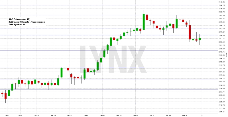 Ähnlich wie in anderen Indizes setzte im S&P-Future am Dienstag ein etwas stärkerer Abwärtsmove ein und bot verschiedene Chancen auf der Shortseite. Die zunächst angenommene Weiterführung der laufenden Longbewegung wurde bereits am Montag uninteressanter. Von Mittwoch bis Freitag lief der Markt dann unter den wichtigen Widerstand von 2.350,00 Punkten und weitere Verkäufe konnten umgesetzt werden. Es bleibt interessant, ob der Markt erneut den Aufwärtstrend aufnehmen kann und sich damit wieder vorteilhafte Chancen auf der Longseite bieten. Für Käufe sollte der Widerstand von 2.350,00 Punkten dauerhaft überschritten werden. Kurse unterhalb dieser Marke könnten erneut für vorsichtige Verkäufe genutzt werden, wobei die Kraft des Marktes für die Kurszielbestimmung berücksichtigt werden sollte.