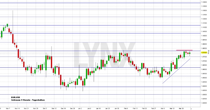 Wie angenommen spielte der Widerstand von 1,0825 in der letzten Handelswoche eine entscheidende Rolle. Nach einem leichten Rücksetzer am Montag konnte der EUR.USD diesen Bereich fast punktgenau anlaufen, was einen sehr interessanten Longtrade ermöglichte. Von Mittwoch bis Freitag konsolidierte der Markt dann erneut leicht, defensive Handlungen mit kleinen Zielen boten verschiedene Möglichkeiten. Der Schlusskurs zum Freitagabend lag im Bereich von 1,0800. Entscheidend für die kommende Handelswoche sollte erneut der Bereich 1,0825 sein. Ein Durchbruch scheint aus charttechnischer Sicht wahrscheinlich und stellt sich somit als favorisiertes Szenario dar. Beständige Kurse bis unter die Unterstützung von 1,0700 sollten diesen Gedanken jedoch etwas relativieren, wobei Shorttrades aktuell noch keine Option darstellen. Erst ein aufkommendes leichtes Shortmomentum könnte die Chance für Verkäufe erhöhen.