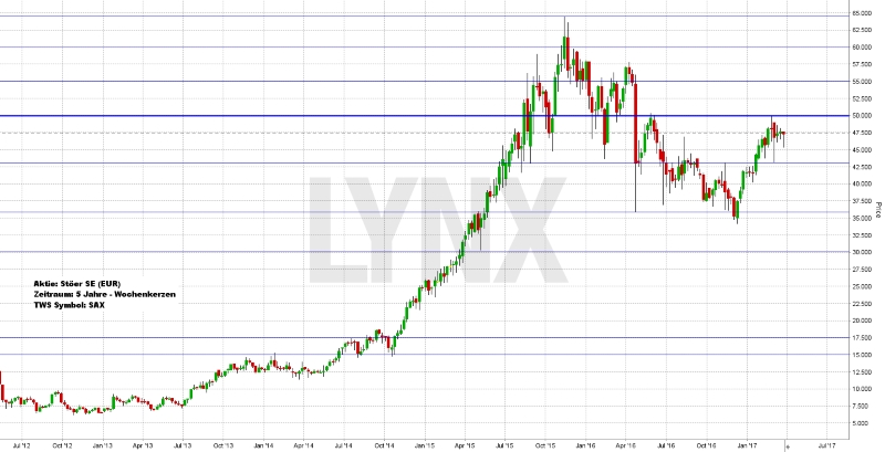 Beim Blick auf den Chartverlauf der letzten fünf Jahre der Ströer-Aktie zeigen sich zwei verschiedene Verläufe. Bis Ende 2015 kann ein sauberer und vor allem sehr lukrativer Aufwärtstrend verzeichnet werden. Aus dem Bereich bei 7,50 Euro lief der Wert hinauf bis auf knapp 65,00 Euro, was einem Anstieg von mehreren 100 Prozent gleichkommt. Zum Ende dieser Aufwärtsphase ist zu beobachten, dass die Volatilität merklich zunahm und es damit auch leicht stärkere Konsolidierungsphasen gab. Ab Anfang 2016 setzte dann eine generelle Konsolidierung ein und der Wert sackte bis Ende 2016 bis auf unter 35,00 Euro. Die Volatilität blieb in dieser Abwärtsphase weiter erhöht. Im aktuellen Jahr schaffte es der Wert, erneut in eine Aufwärtsbewegung überzugehen und der aus charttechnischer Sicht wichtige Widerstand von 50,00 Euro konnte angelaufen werden. Der Schlusskurs der Vorwoche lag knapp unterhalb dieses Widerstands im Bereich der 47,50-Euro-Marke. Jetzt wird spannend, wie sich der Wert um die Marke von 50,00 Euro schlägt. Ein nachhaltiges Überschreiten könnte für weitere Kurse in Aufwärtsrichtung sprechen und der Bereich von 60,00 Euro könnte als ein realistisches Ziel betrachtet werden. Unter der Marke von 50,00 Euro sollten Käufe noch mit etwas mehr Vorsicht genossen werden, da ein Rückfall der Kurse in Richtung 42,50 Euro ebenfalls nicht ausgeschlossen werden kann.