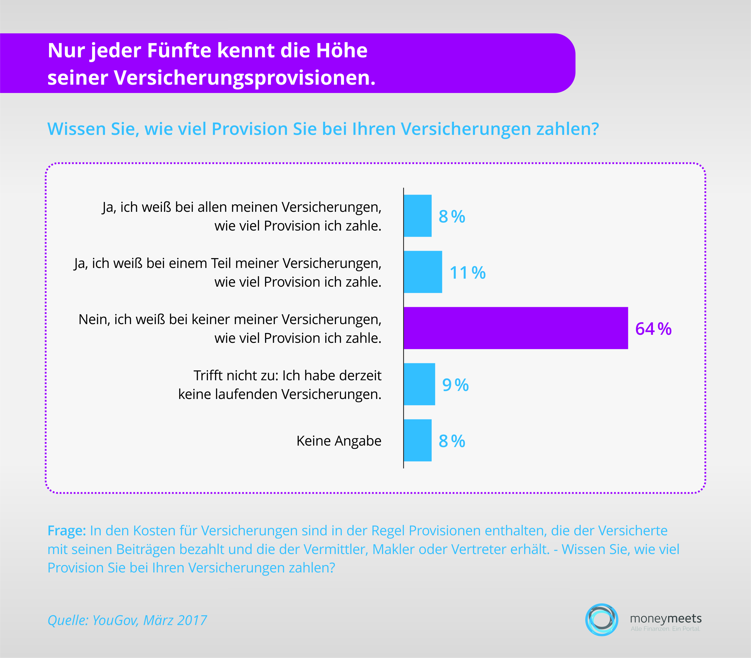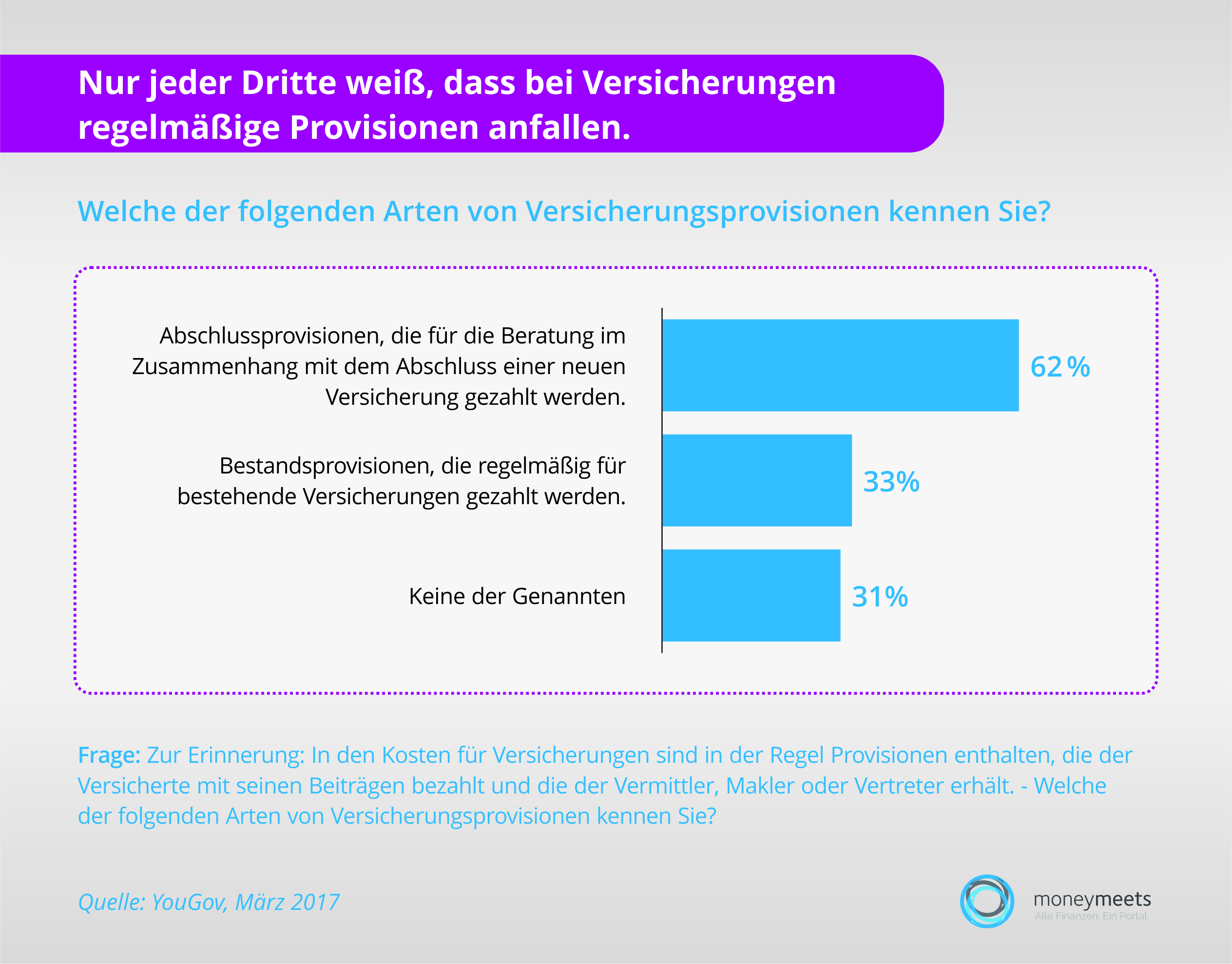 YouGov-Umfrage: Deutsche wissen nicht, wie viel Versicherungsprovision sie zahlenNur jeder fünfte Deutsche kennt die Höhe der Provisionen, die er für seine Versicherungen bezahlt. Auch die Frage nach den Vergütungsstrukturen offenbart große Informationslücken: So weiß nur jeder dritte Verbraucher, dass er mit seinen regelmäßigen Versicherungsbeiträgen Provisionen zahlt, die sein Makler oder Vermittler erhält. Dies sind die Ergebnisse einer repräsentativen Umfrage unter mehr als 2.000 Erwachsenen, die das Marktforschungsinstitut YouGov im Auftrag des Finanzportals moneymeets durchgeführt hat.Köln, den 29. März 2017. Nach Angaben des Bundes der Versicherten (BdV) hat jeder Bundesbürger im Durchschnitt sechs Versicherungsverträge. Für die Beratung erhält der Makler, Vermittler oder Vertreter nach Vertragsabschluss einen gewissen Prozentsatz der Beitrags- bzw. Versicherungssumme als Abschlussprovision. Darüber hinaus fallen bei den meisten Versicherungen dauerhaft Bestandsprovisionen an, die der Kundenpflege durch den Vermittler dienen. Diese werden vom Versicherten mit seinen regelmäßigen Beiträgen bezahlt und fließen so lange an den Vermittler, wie der Versicherungsvertrag besteht. Nur einer von 13 Deutschen hat volle Übersicht über Höhe der VersicherungsprovisionenWie die aktuelle Umfrage zeigt, ist der Mehrzahl der Verbraucher jedoch nicht bewusst, wie hoch die Provisionen bei ihren Versicherungen ausfallen: So kennen lediglich acht Prozent der Verbraucher die für Provisionszahlungen aufgewendeten Beträge bei allen ihren Versicherungsverträgen. Rund 11 Prozent gaben bei der Befragung an, zumindest bei einem Teil ihrer Versicherungen über die Höhe der Provisionen Bescheid zu wissen. Die große Mehrheit, nämlich 64 Prozent, kennen bei keiner einzigen Versicherung die Provisionshöhe. Neun Prozent der Befragten gaben an, derzeit keine laufenden Versicherungen zu besitzen. Die Umfrage macht auch signifikante geschlechtsspezifische Unterschiede deutlich: So kennt zwar fast jeder vierte Mann (23%) die Provisionshöhe bei allen oder zumindest bei einem Teil seiner Versicherungen, bei den befragten Frauen gab dies hingegen nur jede Sechste (17%) zu Protokoll. Noch unterschiedlicher fallen die Ergebnisse mit Blick auf den Bildungsgrad aus: Während nur jeder vierzehnte Befragte (7%) ohne Bildungsabschluss die Kosten ganz oder teilweise kennt, weiß rund jeder fünfte Student (19%), Auszubildende und Befragte mit abgeschlossener Berufsausbildung (jeweils 18%) über die Höhe der Vergütungen vollständig oder in Teilen Bescheid. Am besten im Bilde sind Akademiker: Rund jeder vierte Absolvent (26%) einer Fachhochschule oder Universität beantwortete die Frage nach der Kenntnis der Provisionshöhe für alle bzw. zumindest für einen Teil seiner Verträge positiv. Bestandsprovisionen – die große UnbekannteEin geteiltes Bild zeigt sich bei der Frage nach der Kenntnis der Vergütungsstrukturen im Versicherungsgewerbe. Während sich immerhin 62 Prozent der Befragten darüber im Klaren sind, dass bei den meisten Versicherungen Abschlussprovisionen anfallen, kennt nur rund jeder Dritte (33%) die so genannten Bestandsprovisionen, die regelmäßig mit jeder Beitragszahlung zu entrichten sind. Einem ähnlich hohen Prozentsatz, nämlich 31 Prozent der Befragten, ist weder die eine noch die andere Provisionsart bekannt. Kostentransparenz bei moneymeets2.387 Euro gibt der Durchschnittsdeutsche laut moneymeets-Berechnungen im Jahr für Versicherungsbeiträge aus – die gesetzliche Kranken-, Arbeitslosen- und Rentenversicherung nicht eingerechnet. Bei fast allen Versicherungen fallen laufende Provisionen an, sie machen bis zu 20 Prozent des Jahresbeitrages aus. Diese versteckten Kosten komplett transparent zu machen und seinen Kunden die Hälfte davon zu erstatten, zählt zu den Geschäftsgrundsätzen von moneymeets.com. Denn dank seines digitalen Konzeptes arbeitet das Unternehmen schneller und ökonomischer als klassische Makler und kann die Effizienzgewinne als Preisvorteil an seine Kunden weitergeben.Die gesamte Studie stellen wir Ihnen gerne zur Verfügung. Das Bildmaterial finden Sie hier zum Download:Bild 1Bild 2