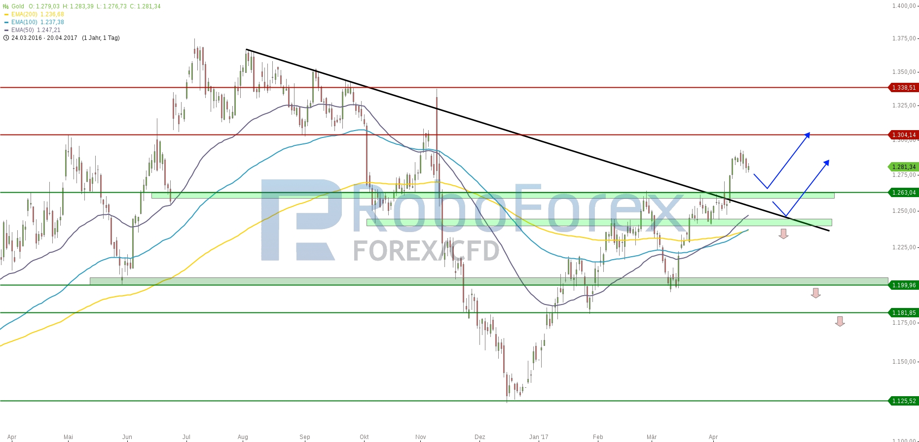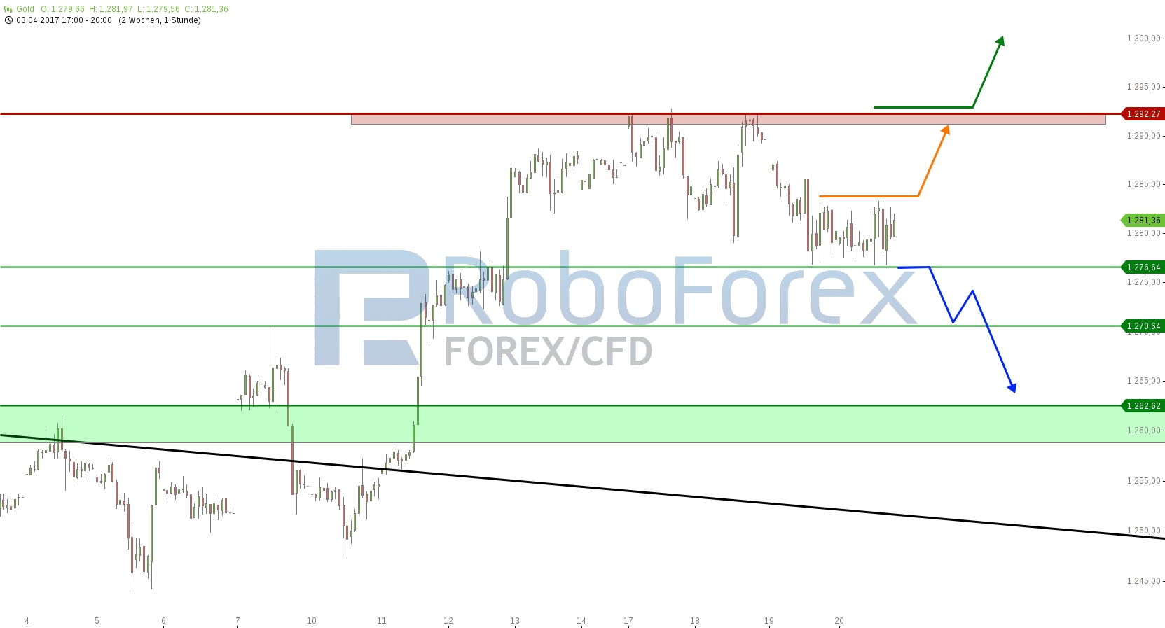 Unter 1.276,- USD würde das Szenario einer Pullbackbewegung an die übergeordnete Abwärtstrendlinie aktiviert werden. Als zwischengeschaltete Kursziele fungieren in diesem Fall die Unterstützungen bei 1.270,- USD und 1.262,- USD, bevor im Anschluss die psychologisch wichtige Marke bei 1.250,- USD in den Fokus der Anleger rückt.
