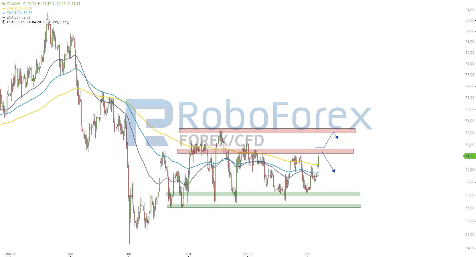 Die Edelmetalle blieben auch vor den Osterfeiertagen gefragt und verzeichneten deutliche Kursgewinne. Gold gelang dabei mit dem Bruch der übergeordneten Abwärtstrendlinie ein bullishes und übergeordnetes Kaufsignal. Bei Silber steht ein ähnlicher Ausbruch allerdings noch aus, sodass das gelbe Edelmetall in den Tagen vor und nach der Wahl in Frankreich die bessere Alternative darstellen dürfte. Der Markt beobachtet mit Sorge den Erfolg der beiden Euroskeptiker Le Pen und Melenchon, da diese die Mitgliedschaft in der Europäischen Union (EU) auf den Prüfstand stellen wollen.
