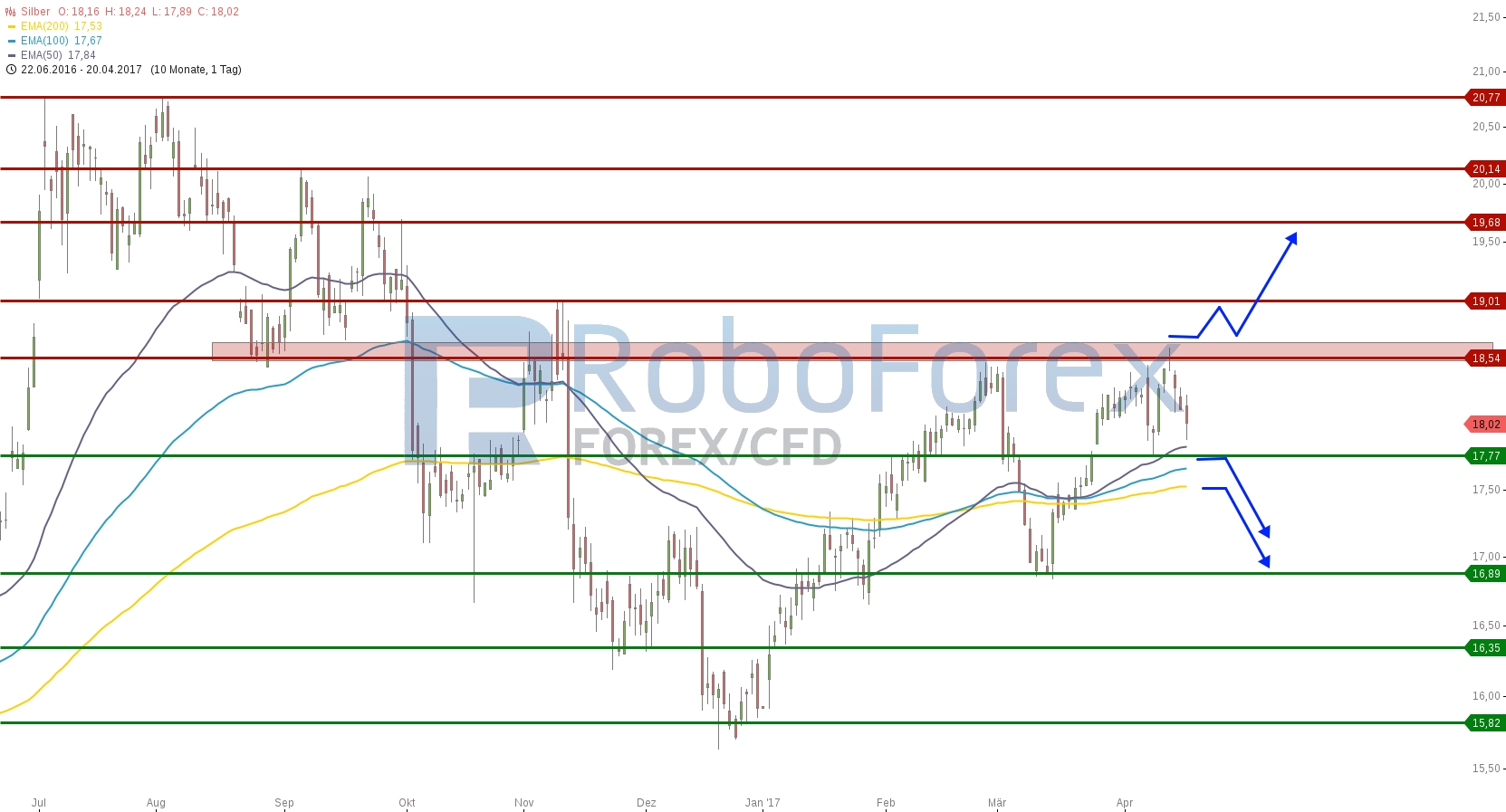 Silber konnte im Vergleich zum großen Bruder Gold kein neues bullishes Signal generieren. Hier wurde das Bewegungshoch vom 27. Februar bei 18,55 USD zwar zwischenzeitlich getestet, konnte aber nicht nachhaltig überwunden werden. Vielmehr erfolgte im Anschluss ein Rücklauf an das Tief vom 10. April bei 17,77 USD. Sofern Silber nachhaltig unter diese Marke und die 200er-EMA (gelbe Linie) fällt, dürfte im Anschluss auch ein Rücksetzer an die Unterstützung bei 16,90 USD möglich sein. Hier bestünde dann erneut die Chance auf eine Stabilisierung.