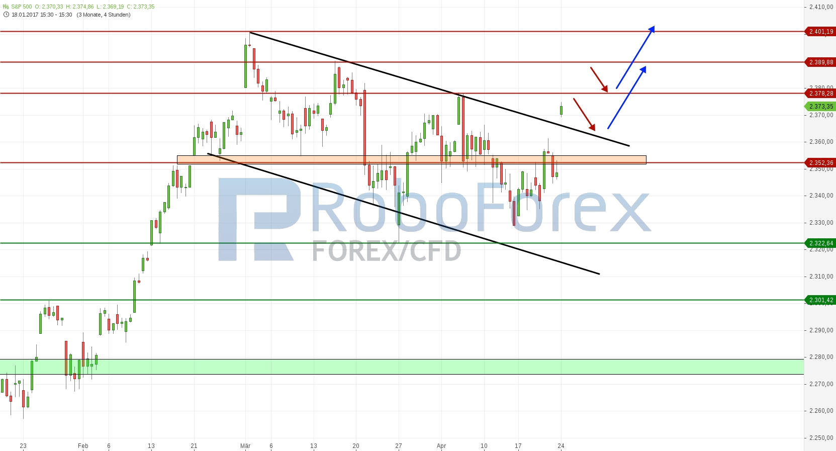Auf der Unterseite bietet zunächst die obere Flaggenbegrenzung sowie das Bewegungshoch vom 20. April bei 2.361 Punkten eine erste Unterstützungszone. Dieser Bereich wäre eine geeignete Zielzone für eine Pullbackbewegung nach der dynamischen bullishen Ausbruchsbewegung. Unter 2.350 Punkten würde sich das Chartbild hingegen wieder deutlicher eintrüben.