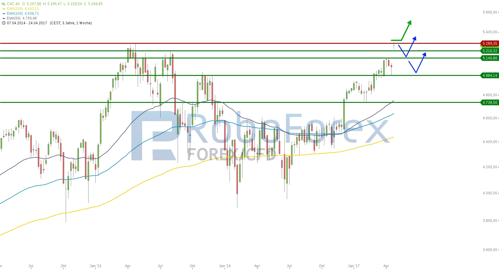 In Anbetracht der Wahl in Frankreich lohnt sich in dieser Woche auch ein Blick auf den französischen Leitindex, den CAC40. Wie auch dem DAX gelang dem CAC40 am gestrigen Handelstag ein neues Allzeithoch bei 5.298 Punkten. Im Vergleich zum Freitag legte der CAC40 am gestrigen Handelstag um 4 Prozent zu und zeigte sich damit deutlich erholt.